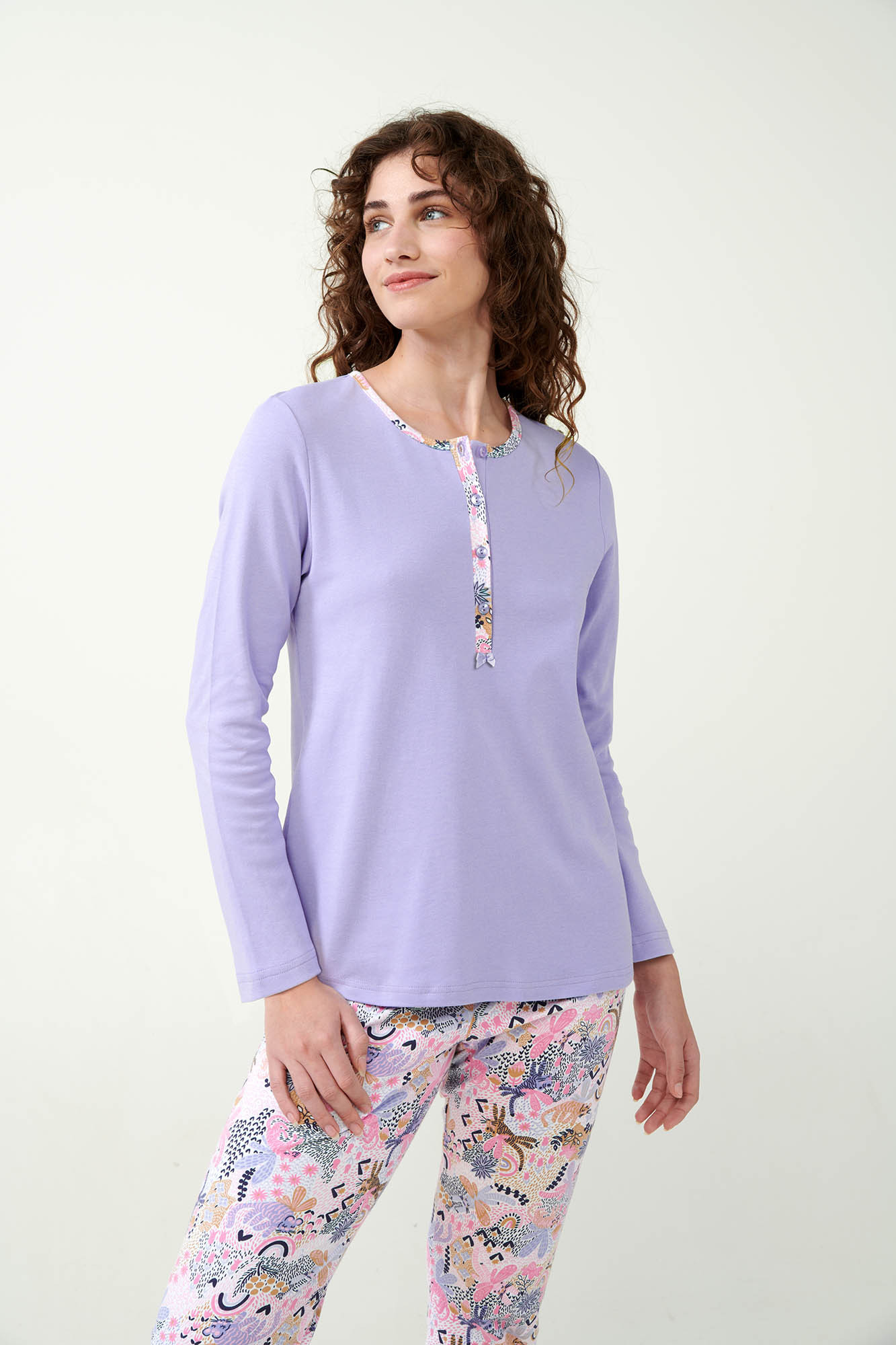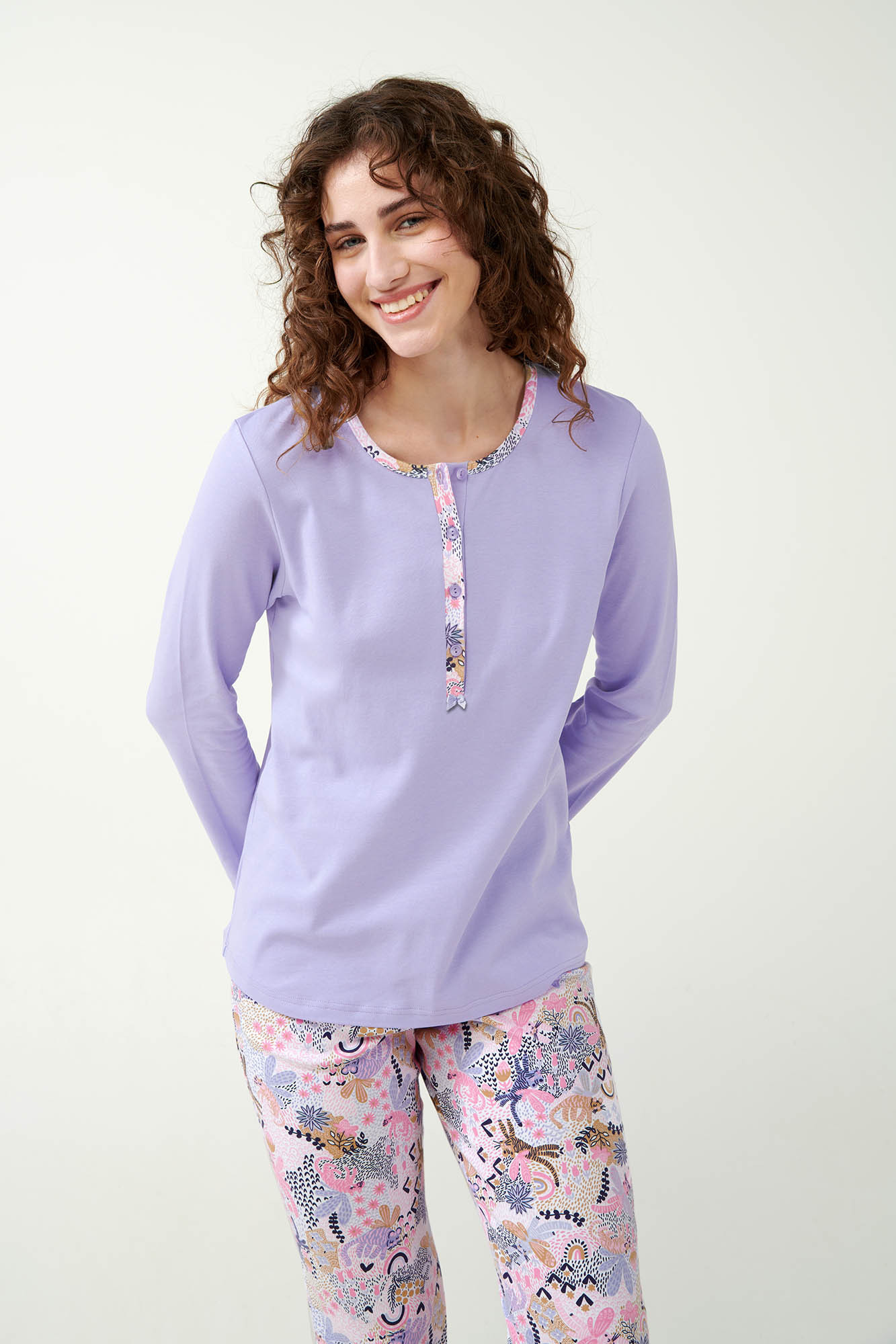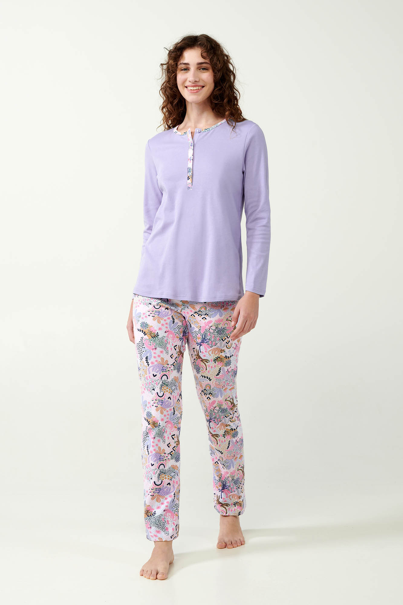 Ponořte se do říše snů s tímto okouzlujícím pyžamem, které má hravý potisk na kalhotách. Vrchní část je navržena s klasickým knoflíkovým zapínáním, což dodává tomuto útulnému setu nádech nadčasového stylu. Vyrobeno ze 100% bavlněného interlocku, toto pyžamo je měkké, prodyšné a dokonalé pro udržení pohodlí během celé noci. Půvabný potisk a uklidňující levandulová barva vytvářejí lahodnou kombinaci, která činí čas na spaní zvlášť výjimečným. Užijte si směs pohodlí a zábavy ve své noční rutině.