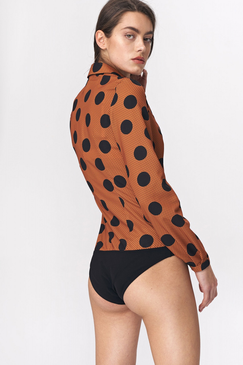 Košilová blůza je skutečnou nezbytností pro jemné kancelářské stylizace. Originální kombinace teplé hnědé a černé barvy a vzor velkých puntíků rozbije klasický kancelářský vzhled. Praktický střih body dokonale přiléhá k tělu a umožňuje vám užívat si nejen působivý vzhled, ale také pohodlí po celý den.