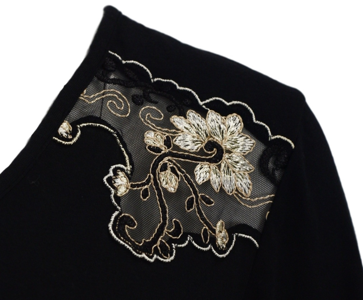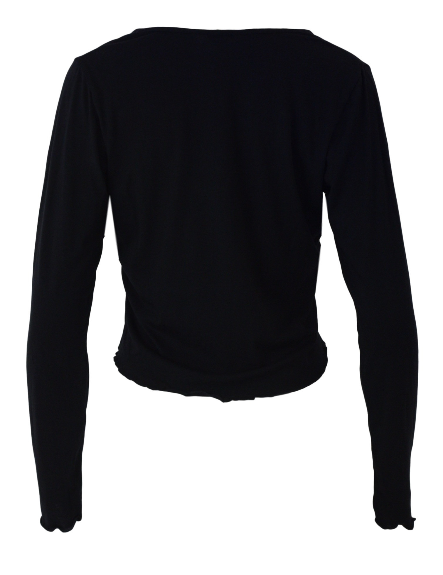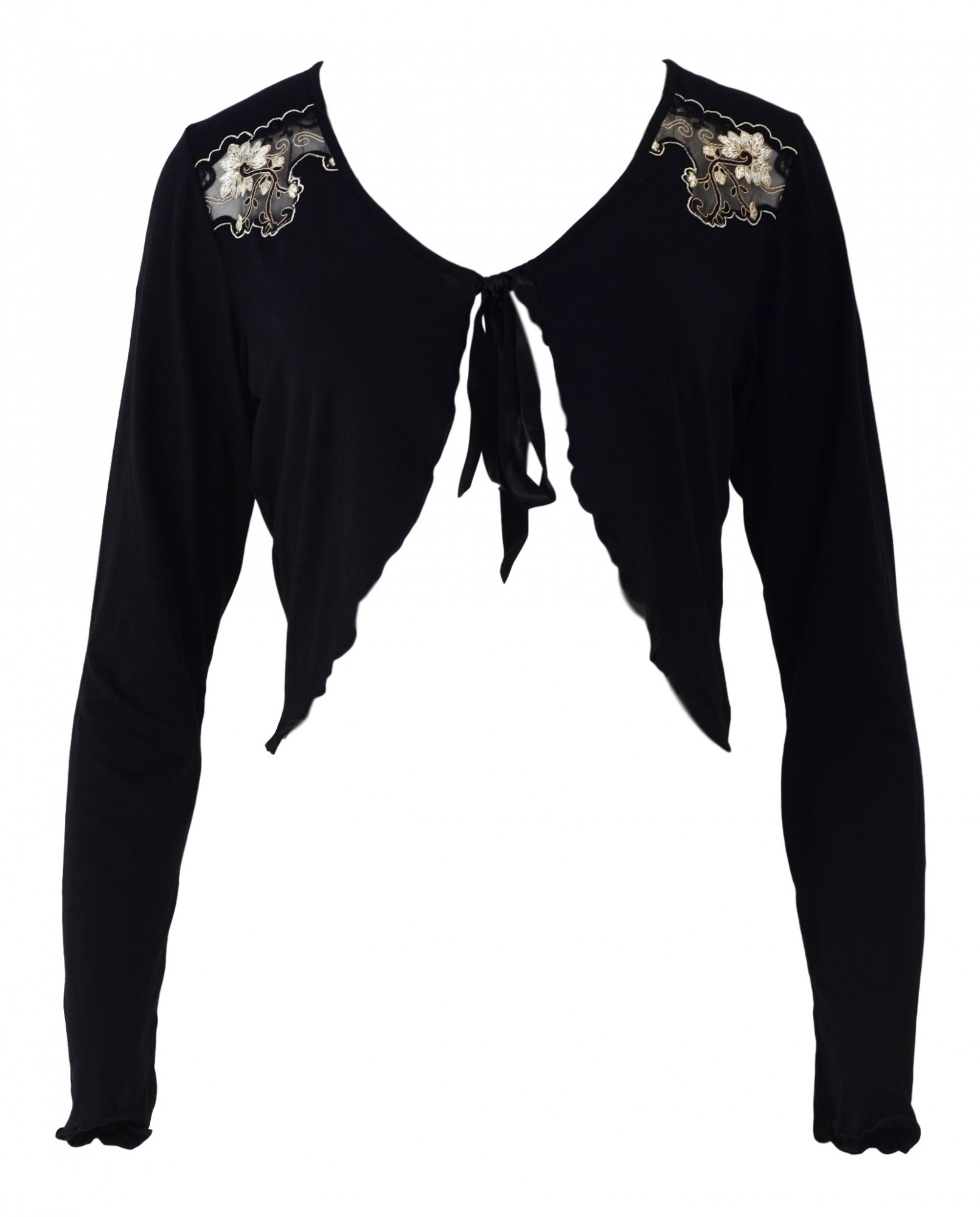 Krátké bolérko s vlnitými okraji, dlouhý rukáv, zavazování na saténovou stužku, na ramenou zdobené průhlednou krajkou.