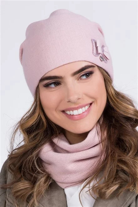 Čepice je vyrobená z teplé příze s přídavkem vlny a je ideálně vypasovaná. Přední díl modelu zdobí půvabná mašlička. Model je dvouvrstvý a vzadu má tři záložky. Čepice je skvělou volbou pro chladné dny.