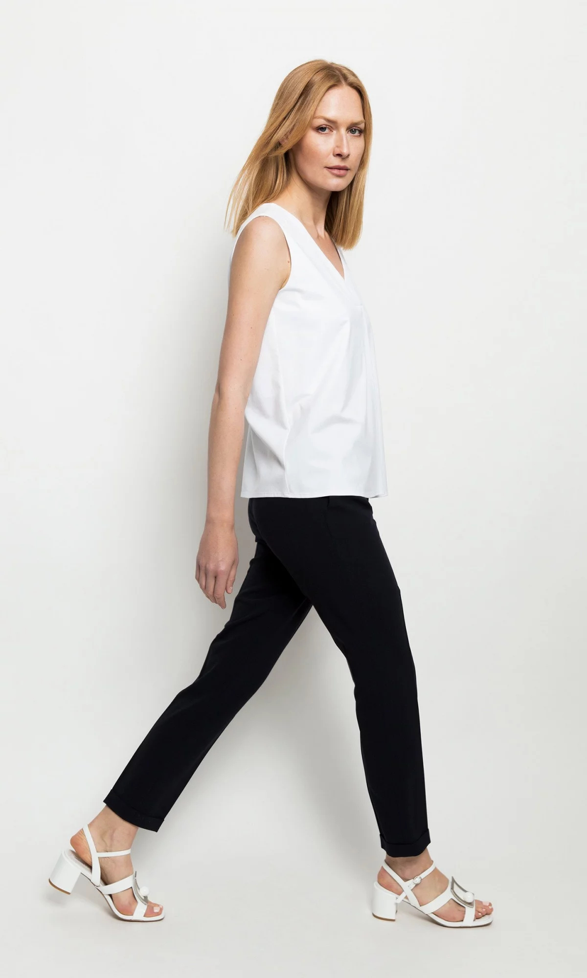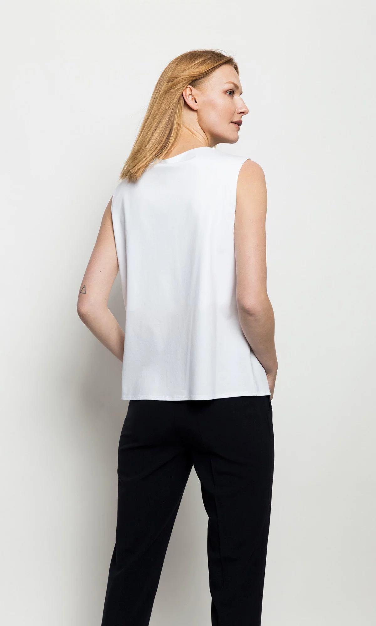 Volný bílý top bez ramínek s výstřihem do V a překrytím vpředu.