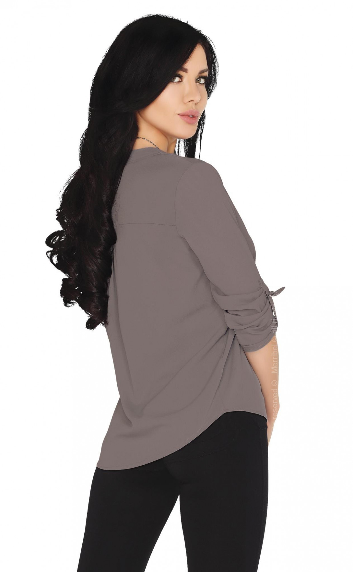 Dámská halenka s dlouhým rukávem, který lze sepnout kovovou přeskou. Výstřih do V, malý stojáček.