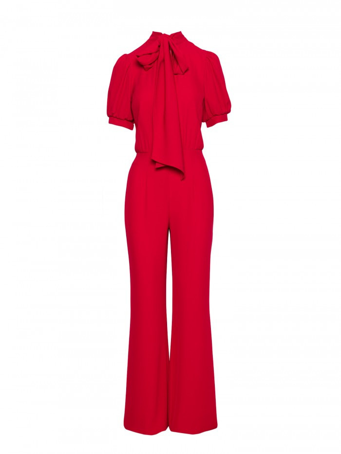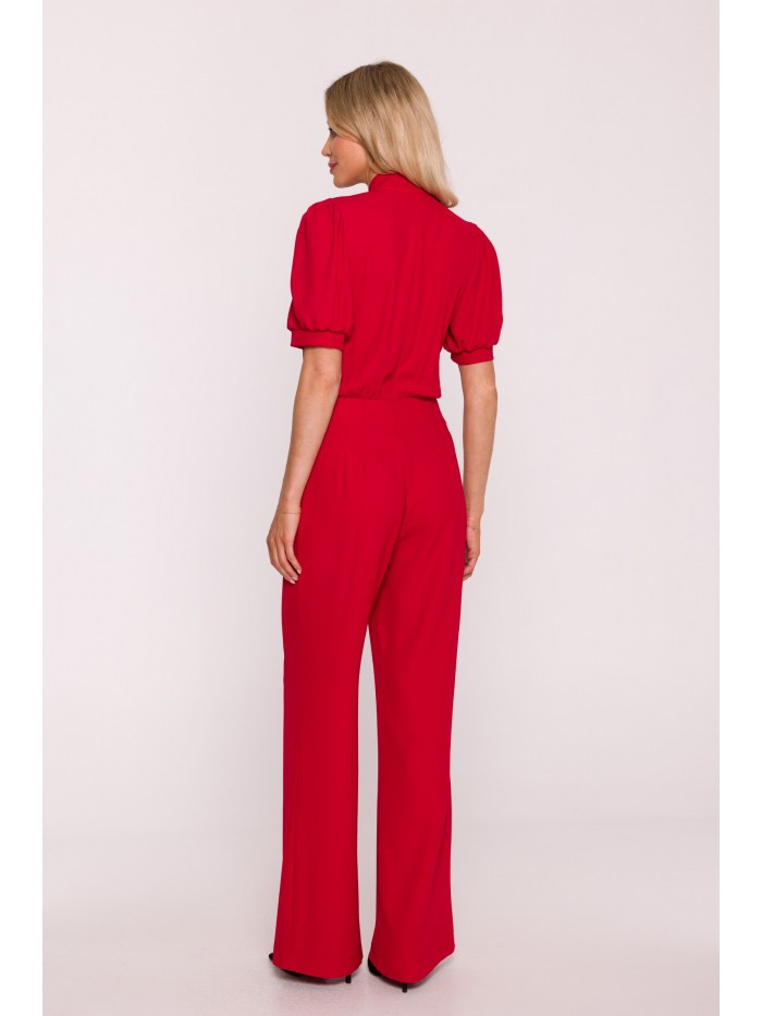 materiál: 95% polyester 5% elastan LÁTKA: hladká tkanina s jemným leskem PODROBNOSTI O PRODUKTU Výstřih: výstřih do V se stojáčkem přecházejícím v zavazování Rukávy: krátké, nadýchané, zakončené manžetami a jemným nabíráním Nohy: dlouhé, široké, směrem dolů mírně rozšířené Pas: zvýrazněný vysokým nártem Zapínání: skrytý zip na zádech Model: S421 Navrženo a vyrobeno v Polsku Modelka je vysoká 174 cm a nosí velikost S STYL A STŘIH Styl: elegantní jednodílný overal Tvar: vypasovaný v pase, mírně nařasený vršek s ozdobným zavazováním, volnější nohavice Délka: po zem