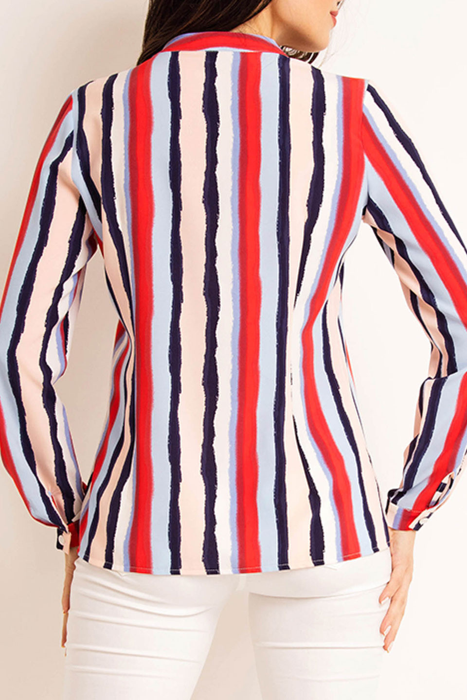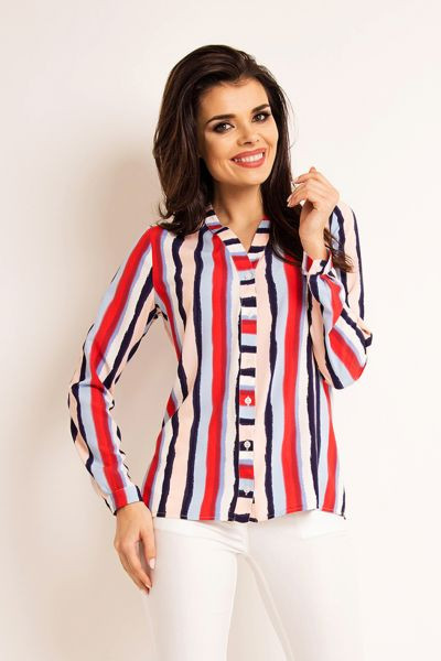 Dámská košile s pruhovaným vzorem, "V" výstřihem, zapínáním na knoflíky a dlouhými rukávy s manžetami na knoflíky. Materiál: 98% polyester, 2% elastan.