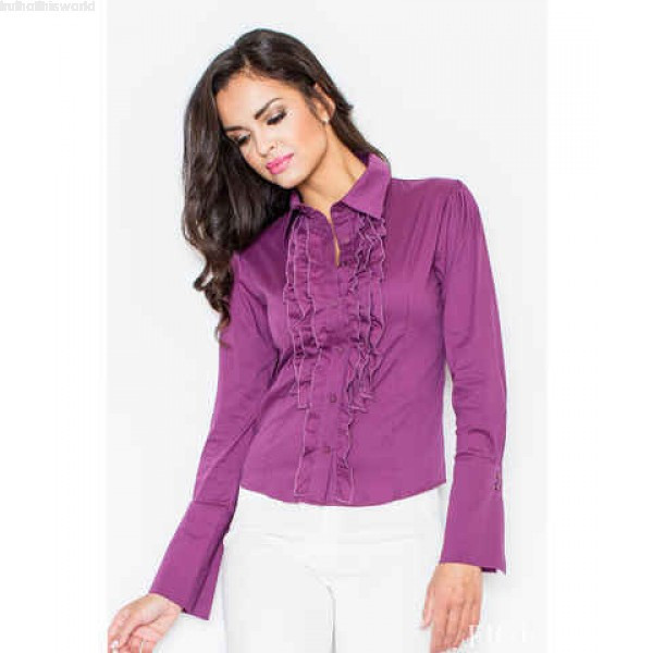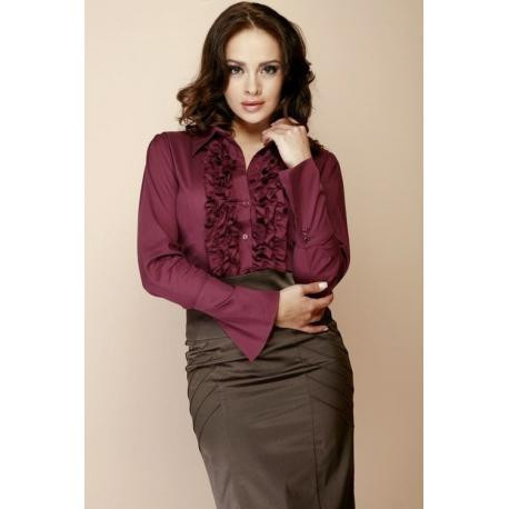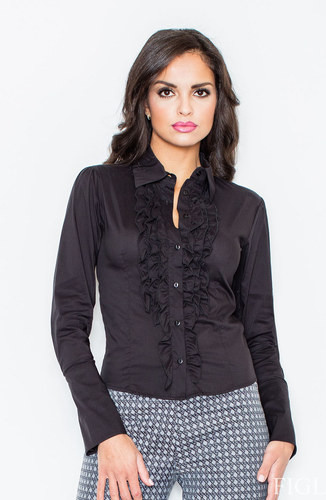 Pro ženu, která se nebojí být sama sebou. Oblečení podtrhuje její radost ze života a nezaměnitelný optimistický životní postoj. Černá košile s volánky okolo zapínání, má dlouhé rukávy s ozdobnými manžetami.