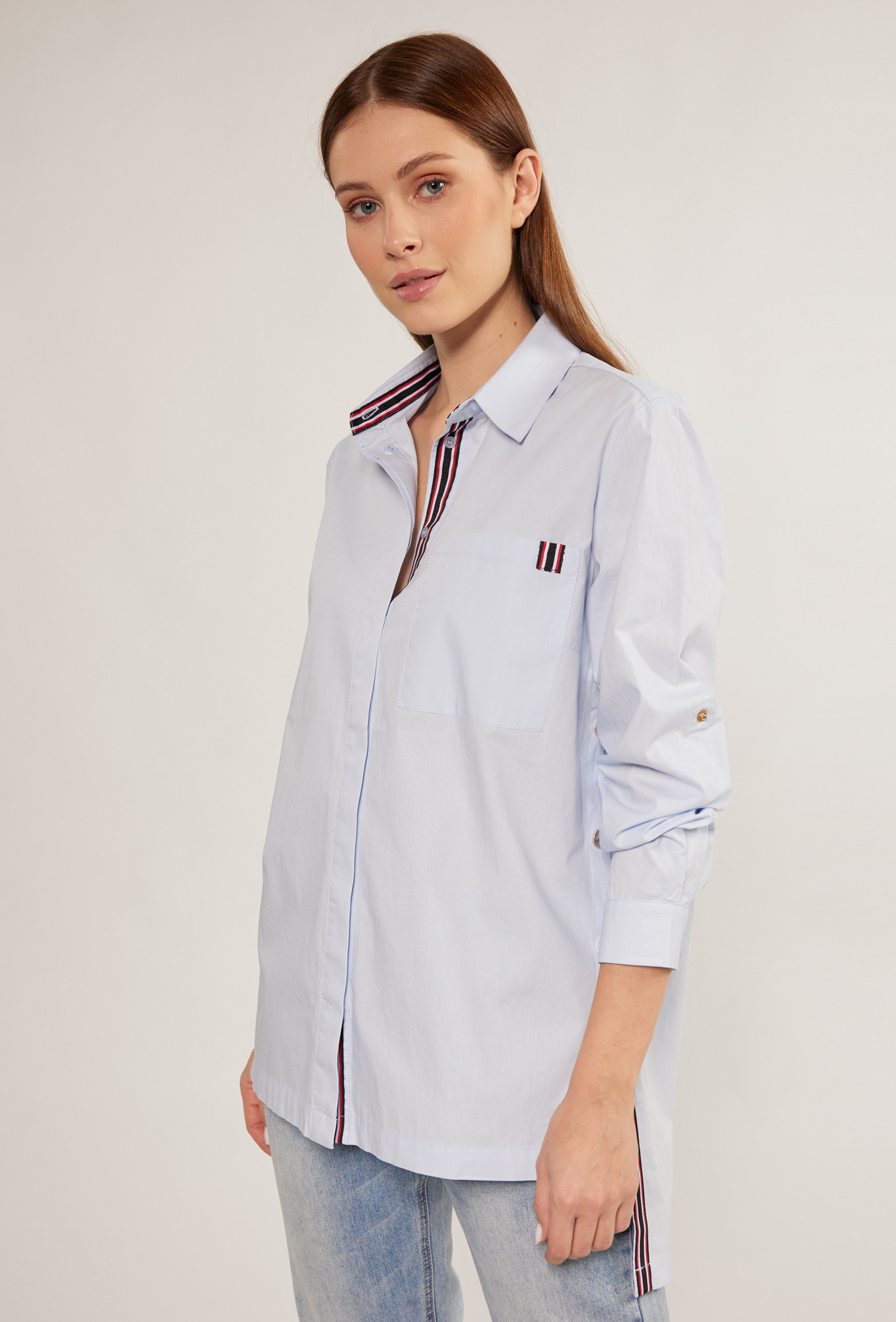 Bavlněné dámské tričko s ozdobnými vsadkami v podobě pruhů. Košile s dlouhými ohrnutými rukávy a rozparky na bocích. Košile s prodlouženým zadním dílem, zapínaná na knoflíky s klasickým límcem. Na linii poprsí je našitá kapsa. Tento model je ideální pro každodenní použití i pro zvláštní příležitosti.