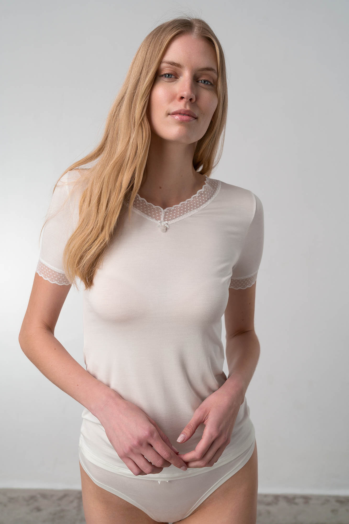- výstřih do V s krajkou, krátký rukáv