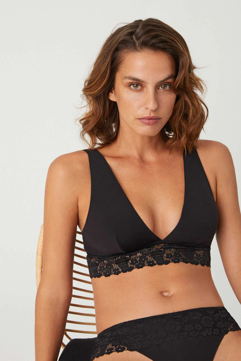 Dámská podprsenka se vsazenými vložkami, bez kostic, spodní i zadní část z hrubé luxusní krajky.