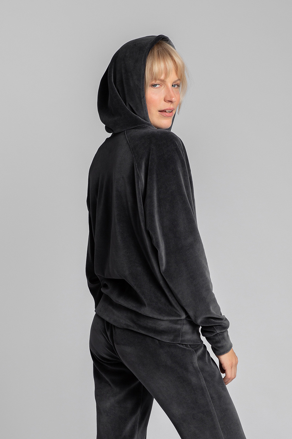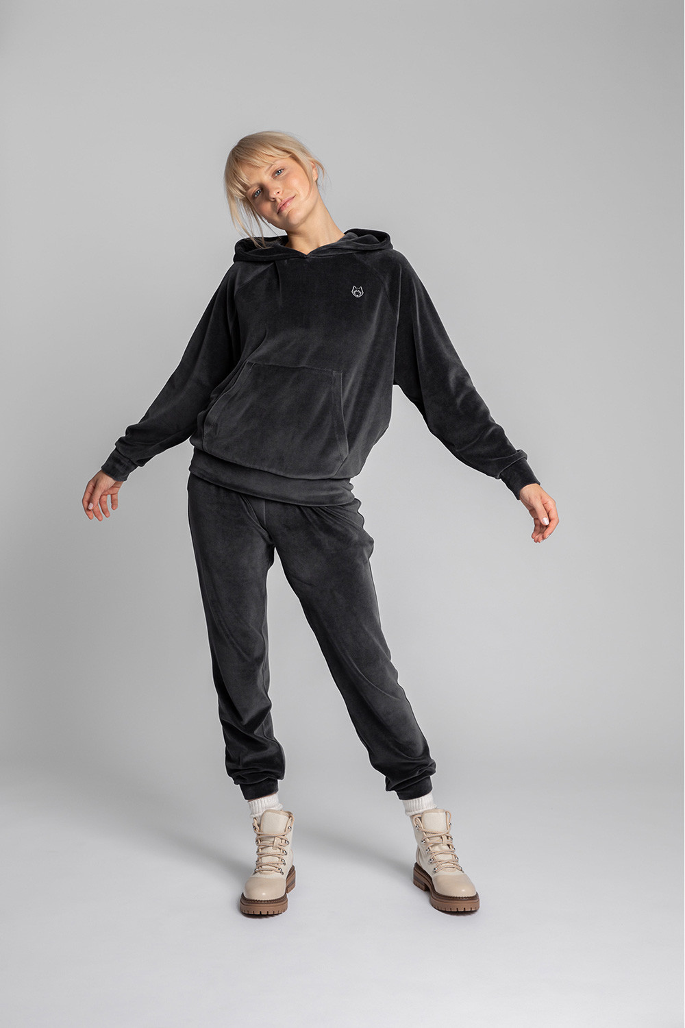 Velurová mikina nadměrné velikosti s prodlouženými netopýřími rukávy s manžetami, klokaní kapsou, kapucí a ozdobnou výšivkou vlka na hrudi. Naprostá nezbytnost pro nošení doma nebo když potřebujete něco teplého na podzimní výlet.