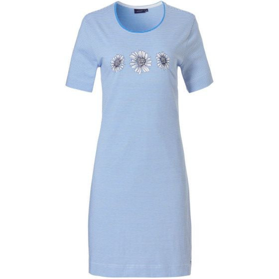 Dámská světle modrá noční košile od značky Pastunette s potiskem 3 kopretin obklopených drobnými kamínky na hrudi. Noční košile má krátké rukávy a kulatý výstřih.
