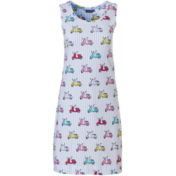Dámská bílomodrá svisle pruhovaná noční košile bez rukávů od značky Rebelle. Na noční košilce je i potisk veselých skútrů.