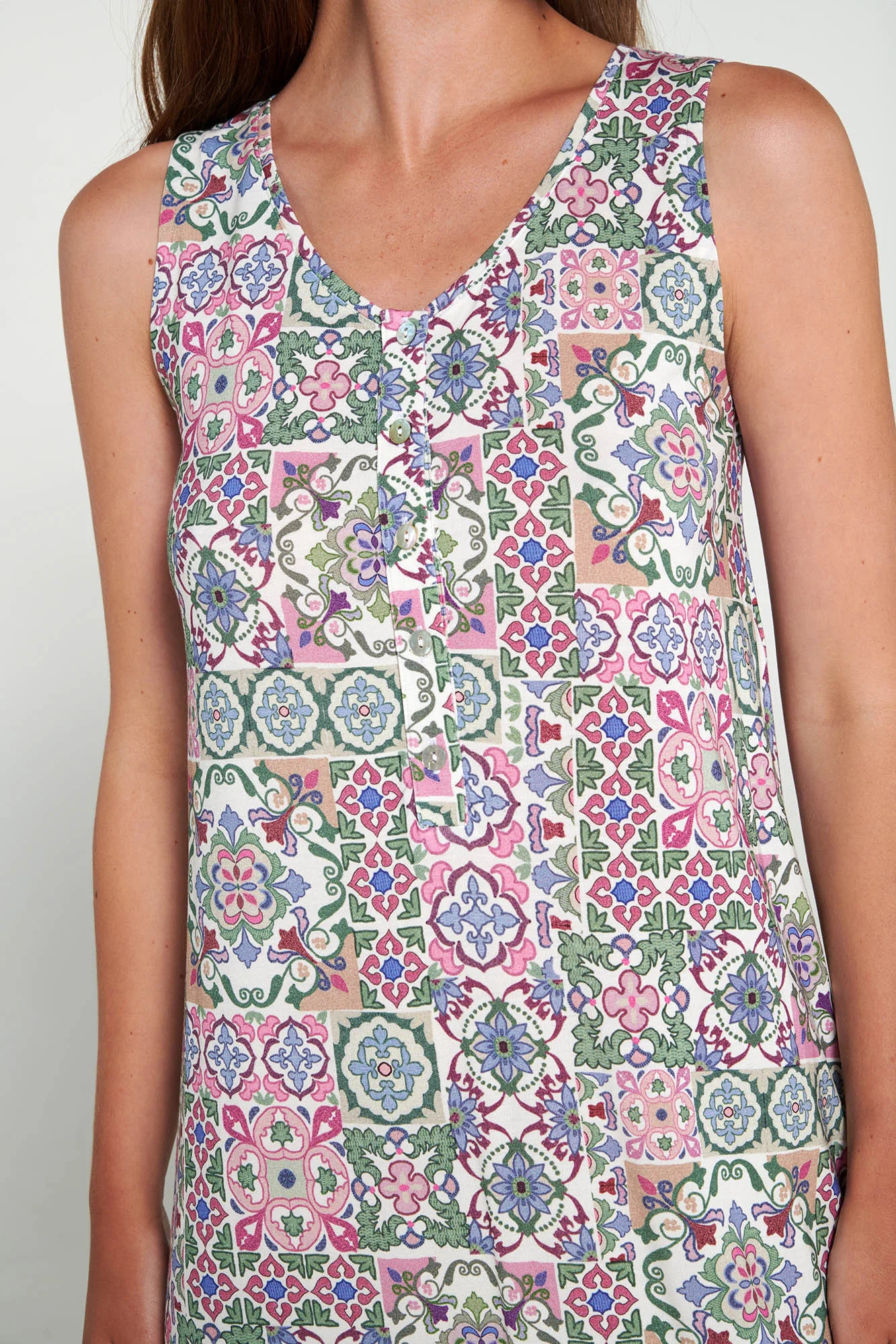 Noční košile bez rukávů s knoflíkovou légou ve volném střihu. Vyrobeno z měkké tkaniny ve vintage stylu.