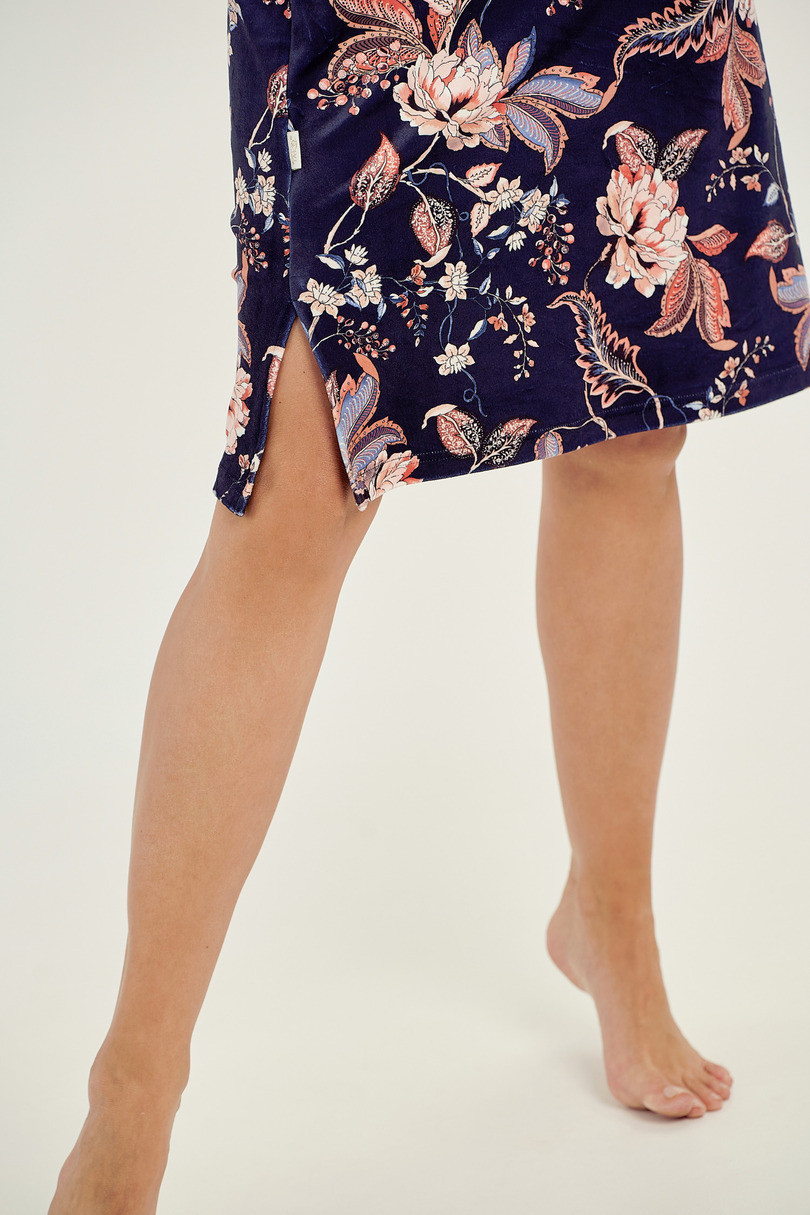 Noční košile 3060 Venus TARO - tmavě modrá barva - je vyrobená z velmi kvalitního veluru - s dlouhými rukávy - zdobená potiskem s květinovým motivem