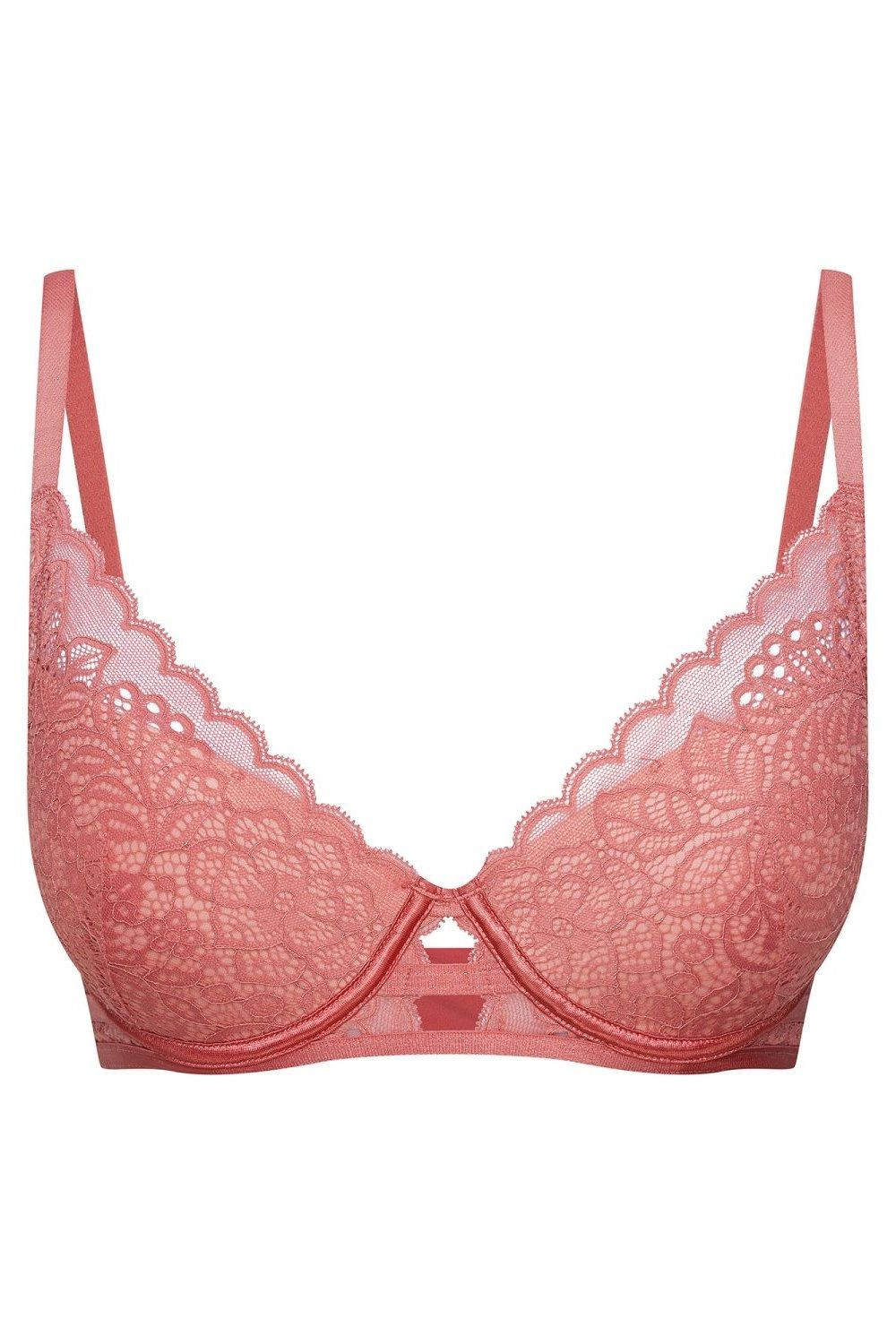 Zobrazit popis > Dámská podprsenka 40659 Hint8 HENDERSON - růžová barva - push up košíčky - kostice - košíčky zdobené tylovou krajkou s květinovým motivem - vyjímatelné vycpávky - nastavitelná a neodepínatelná ramínka - zapínání na dva háčky s třístupňovým zapínáním Materiálové složení: 88% polyamid,12% elastan
