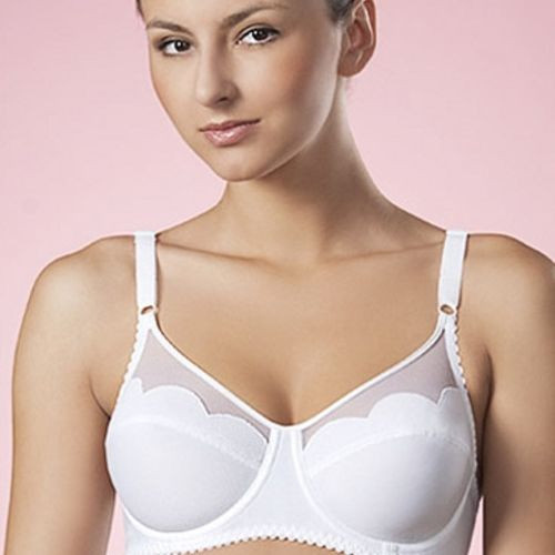 Jednoduchá podprsenka s kosticí, osvědčený střih, velmi dobře sedí i ve větších velikostech košíčků, hladký vzhled, zajímavé řešení košíčků: kombinace průsvitného tylu a základního materiálu.