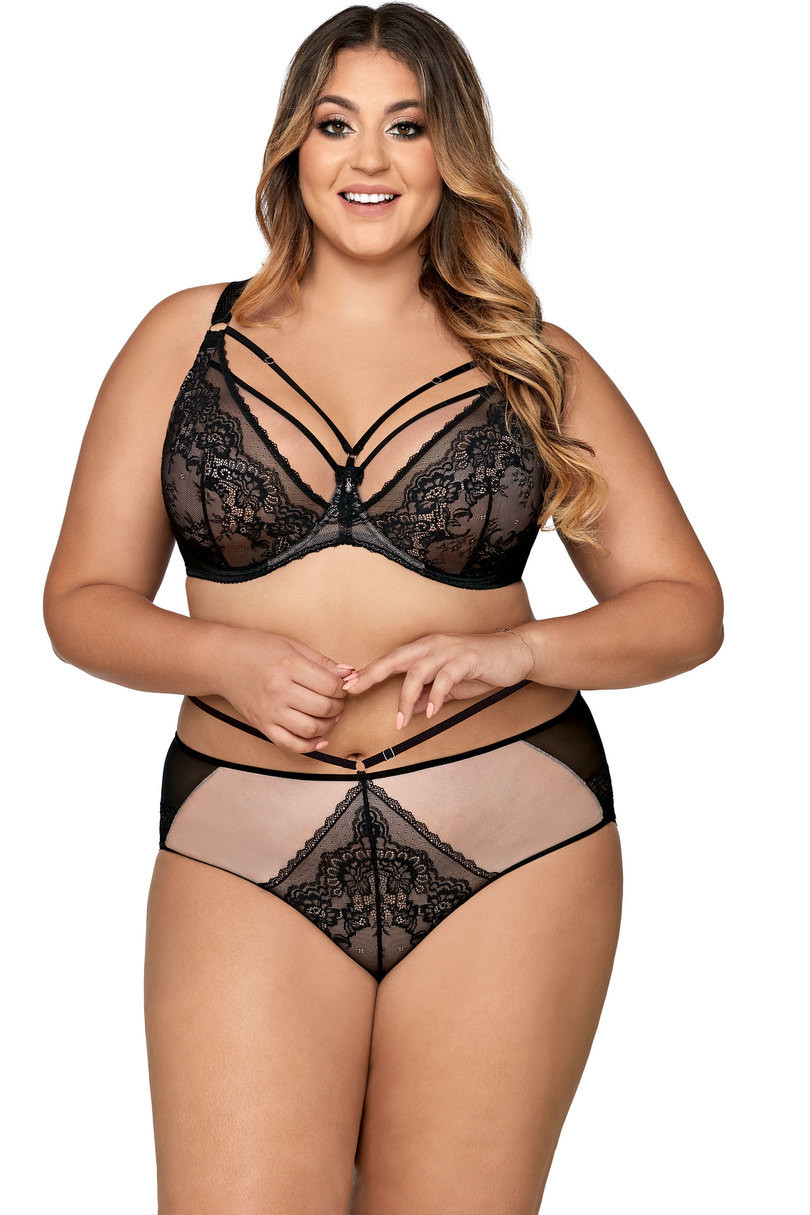 Krásný model měkké podprsenky z krajkové tkaniny. Košíčky i jejich střed zdobí krajka a jemná síťovina. Vrchní linii dekoltu lemuje černý pásek. Mezi košíčky vyniká ozdobná mašlička s přívěskem. Ramínka lze libovolně regulovat, nemůžete je však odepínat. Obvod tvoří pružná lycra. Zapínání je řešeno klasickými háčky. Měkká struktura košíčků dodá ňadrům hezký, přirozený tvar. Díky prodyšnosti tkaniny nebudete ani vědět, že na sobě máte podprsenku. Pohodlí zaručuje perfektní střih a maximální promyšlenost tohoto modelu. Ozdobné strapsy v dekoltu mají také možnost regulace.