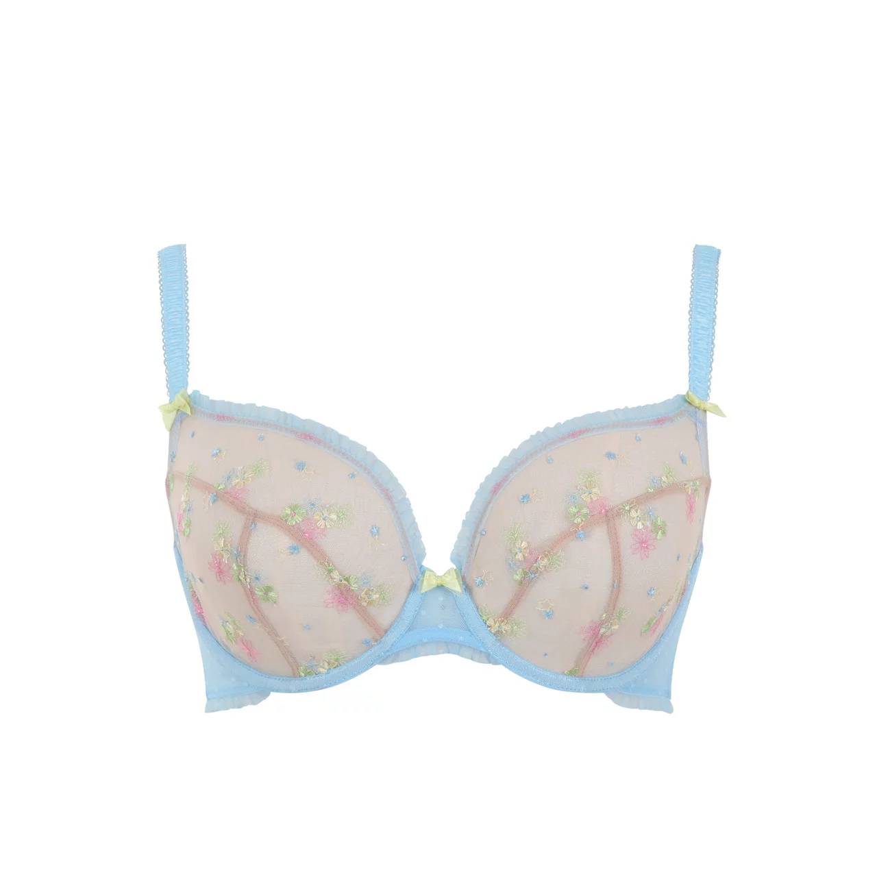 Složitá pevná květinová výšivka pro podpůrný a zároveň módní vzhled. Snížený sed drátků pro menší zakrytí a větší dekolt, dokonalý hluboký tvarMódní detaily s bodovou síťovinou a volánkovými gumičkami.