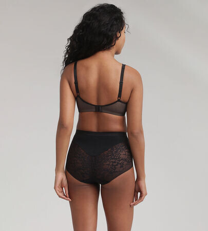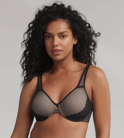 Dámská podprsenka v tělové barvě, potažená černým tylem, na spodní části košíčků našitá luxusní krajka. Ramínka jsou posouvací, zapínaní je na zádech na dva háčky.