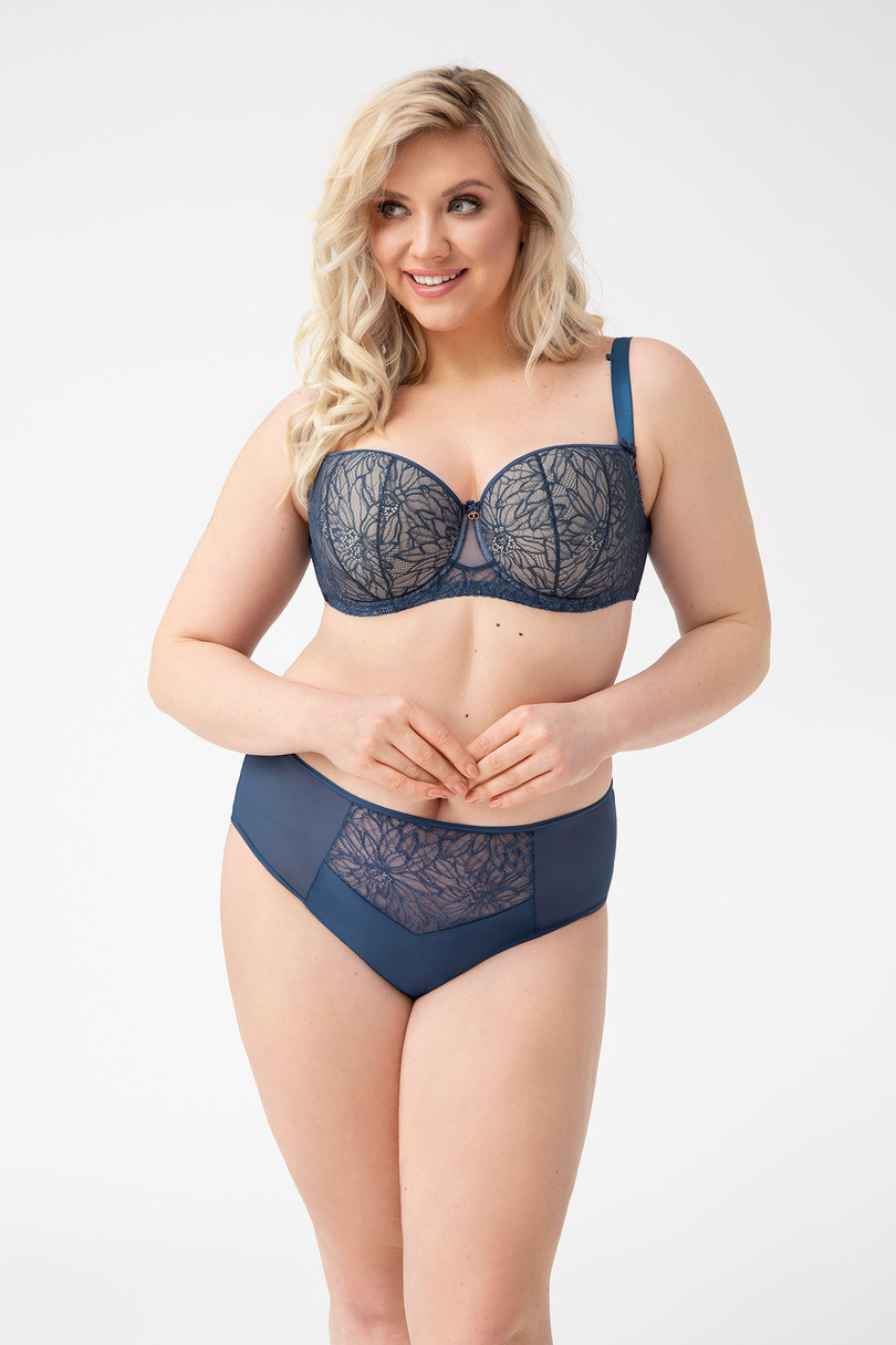 Balkonová podprsenka podle vzoru K 662 (LIPSI) ve francouzské modré barvě. Díky tvaru vyztužených košíčků je dekolt odhalen a prsa jsou dokonale podepřena, takže získají plný, zaoblený tvar. Doplňková ozdoba v podobě tróuhlového chokeru z tylu a pevného pléna, který je nastavitelný a odnímatelný. Misky vyztužené měkkou pěnou v tělové barvě, na které je položen modrý stabilní plén s květinovým motivem , góra zakončené lomenou páskou, z vnitřní strany misek kapsa na push-up vložky.