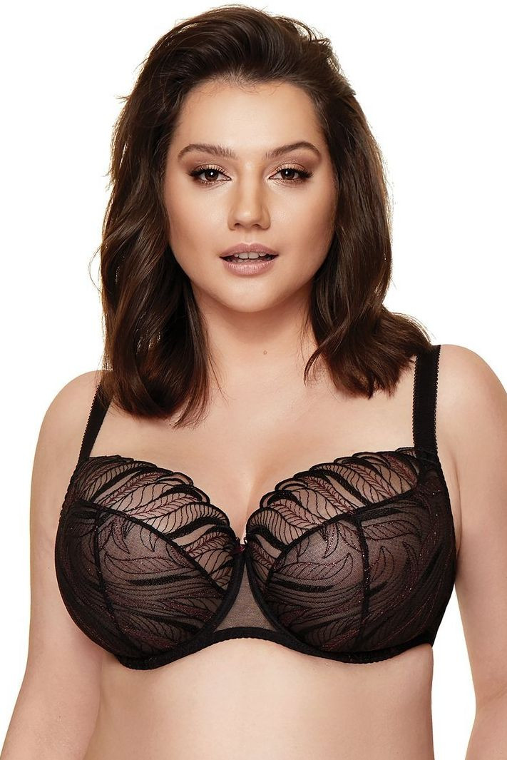 Měkká kráska pro větší poprsí! Elegantní a svůdná podprsenka, která zvýrazní váš dekolt. Košíčky jsou z příjemného tylu zdobeného výšivkou z měděné nitě. Košíčky ňadra nahrnou do středu dekoltu, udrží je ve správné pozici, uleví vašim zádům a ňadrům dodají šmrncovní tvar. Košíčky lemují kostice. Obvod tvoří pevnější tyl, který je však dostatečně elastický. Ramínka lze dle libosti regulovat. Obvod je navíc doplněn svislými výztuhami, aby se podprsenka nikde nepřetáčela. Luxusní kousek, ve kterém se budete cítit sebejistě!
