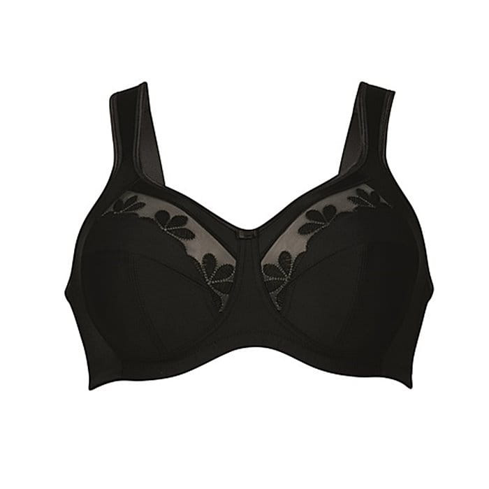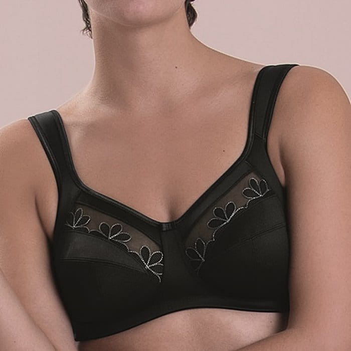 Pohodlná, měkká podprsenka bez kostic značky Anita. Vyrobená z "prodyšného", pro tělo příjemného mikrovlákna, zdobeného květinovou výšivkou na tylu. Třídílná konstrukce košíčků s bočními lištami dokonale tvaruje poprsí. Široké, měkce podšité ramenní popruhy zmírňují tlak na ramena a krk. Zajišťuje nejvyšší komfort nošení v kombinaci s dokonalou podporou i velkých prsou.