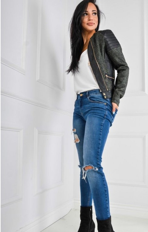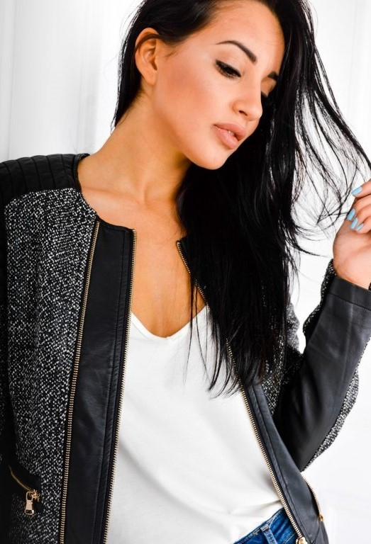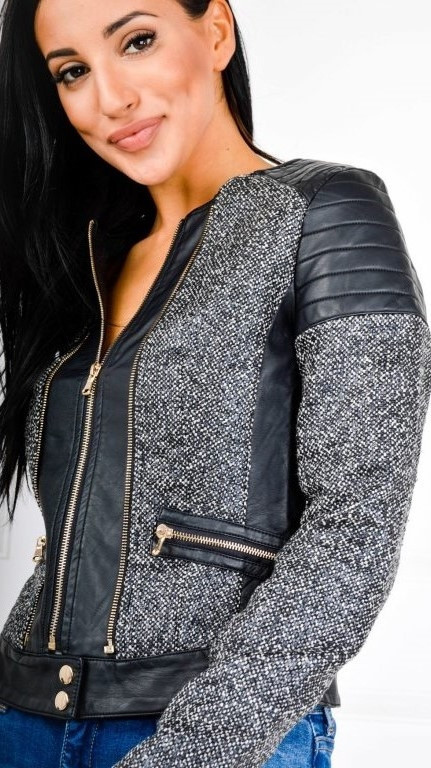Moderní dámská bunda. Bunda má kožené zdobení v oblasti ramen, boků, kapes a dolního lemu. Zapínání této bundy je na zip, ve spodním lemu jsou dva druky. Bundu můžete doplnit velkou šálou. Moderní bunda vhodná především pro volnočasové aktivity.