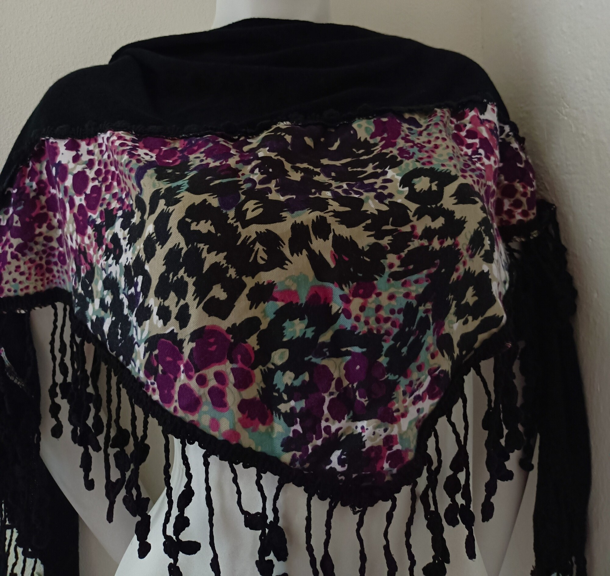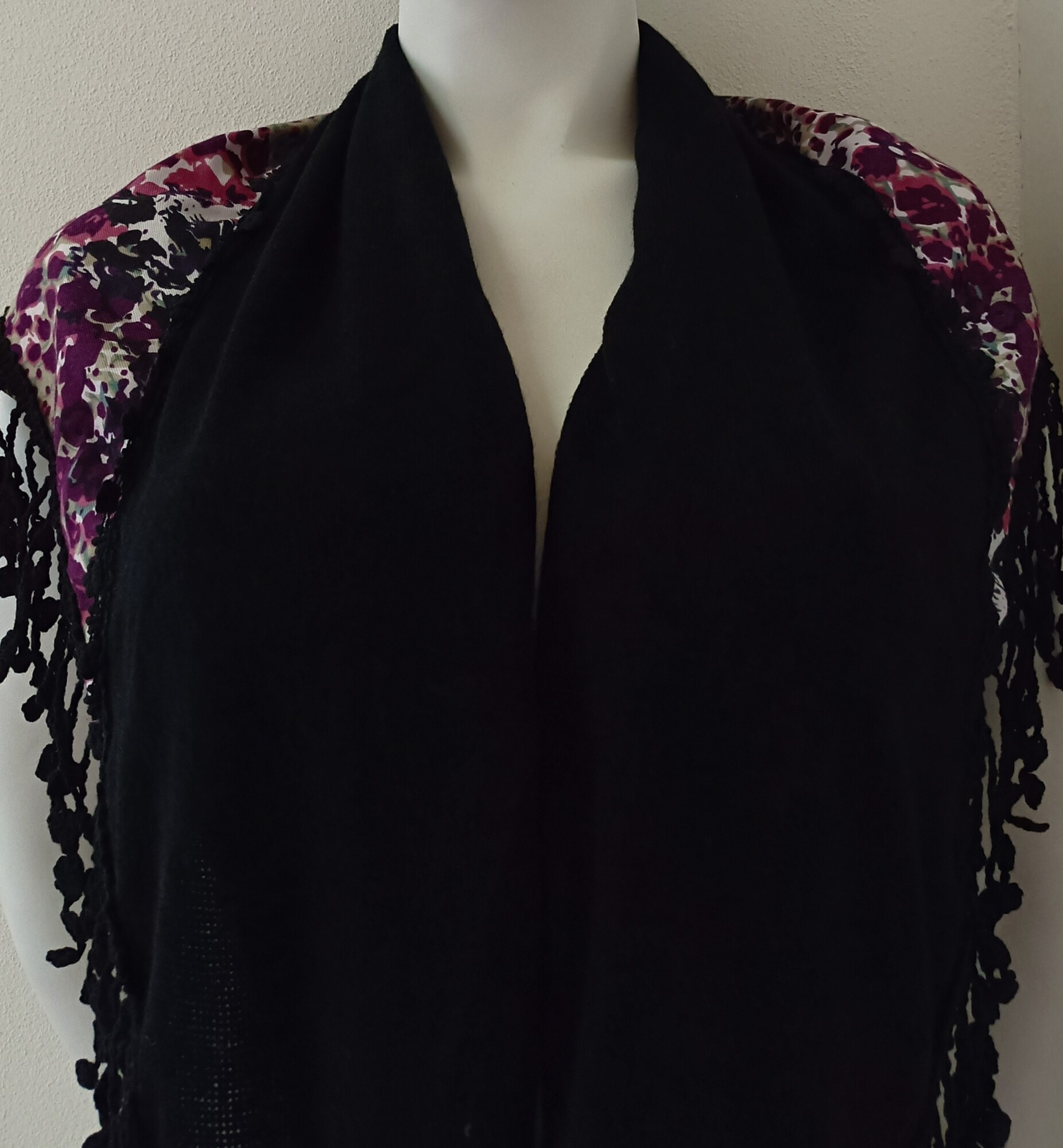 Dámský černo-fialový trojhranný šátek. Po krajích strapce.