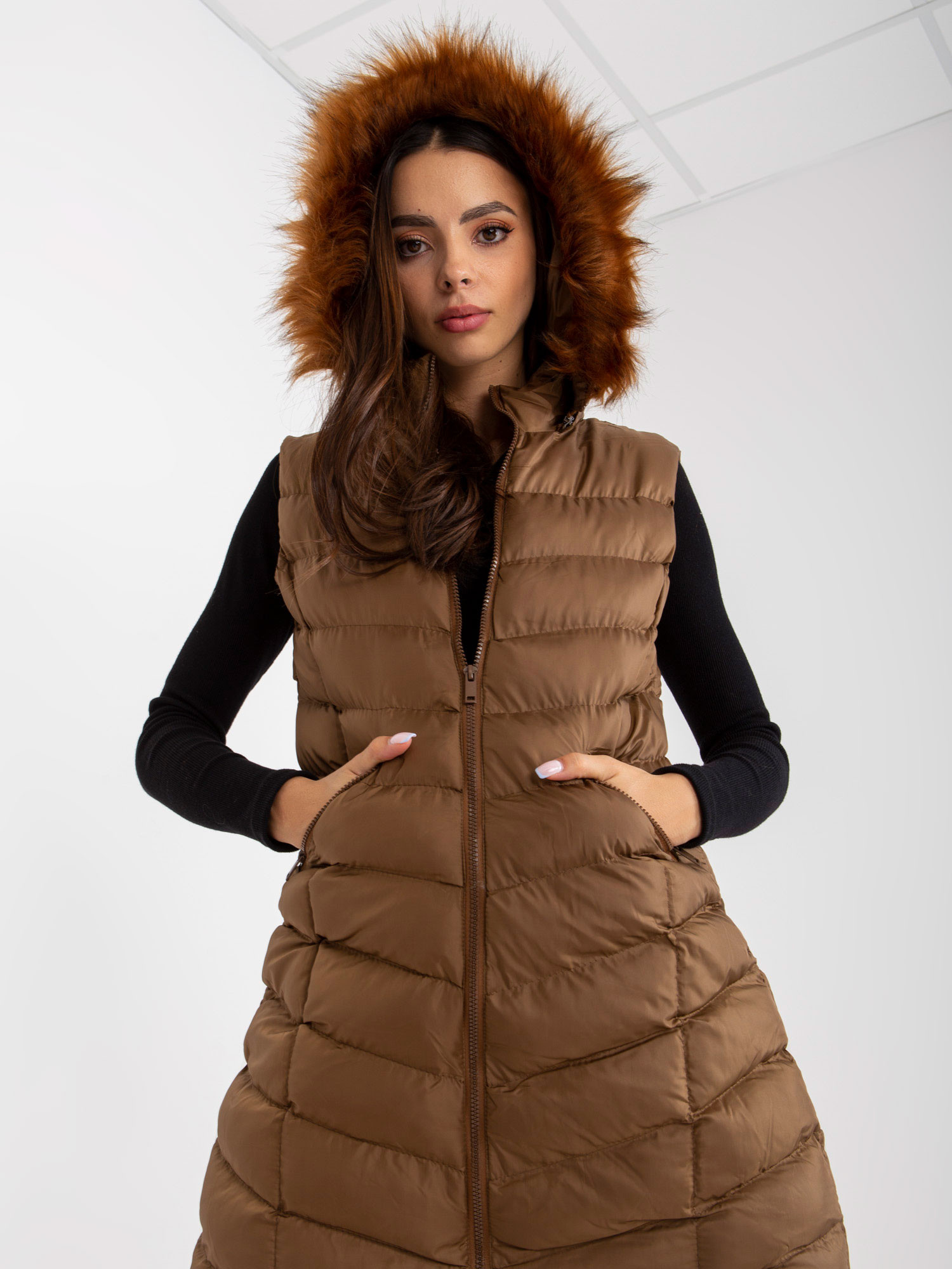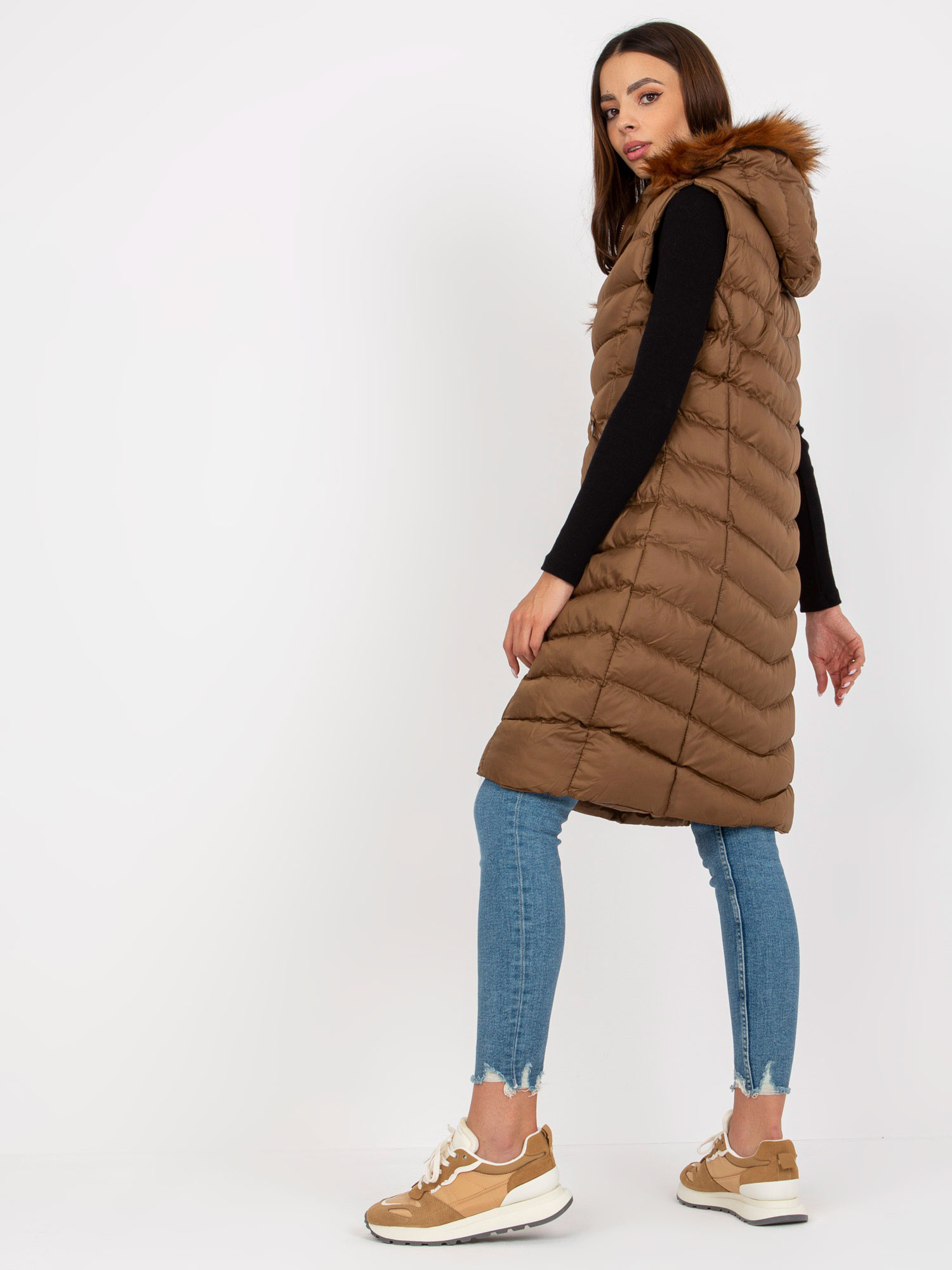 Hnědá dlouhá péřová vesta s kapucí RUE PARIS .