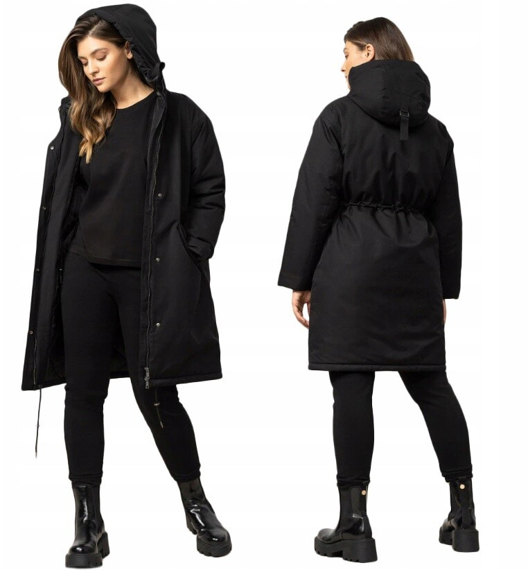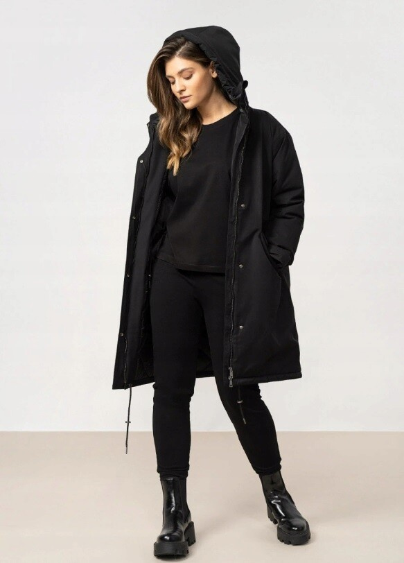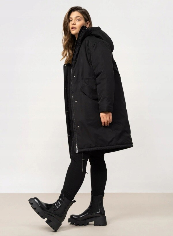 Dámská zimní bunda dlouhá, se stahováním v pase. Kapuce je součástí bundy. Zapínání na zip, překrytý pásem na knoflíky. S kapsami.