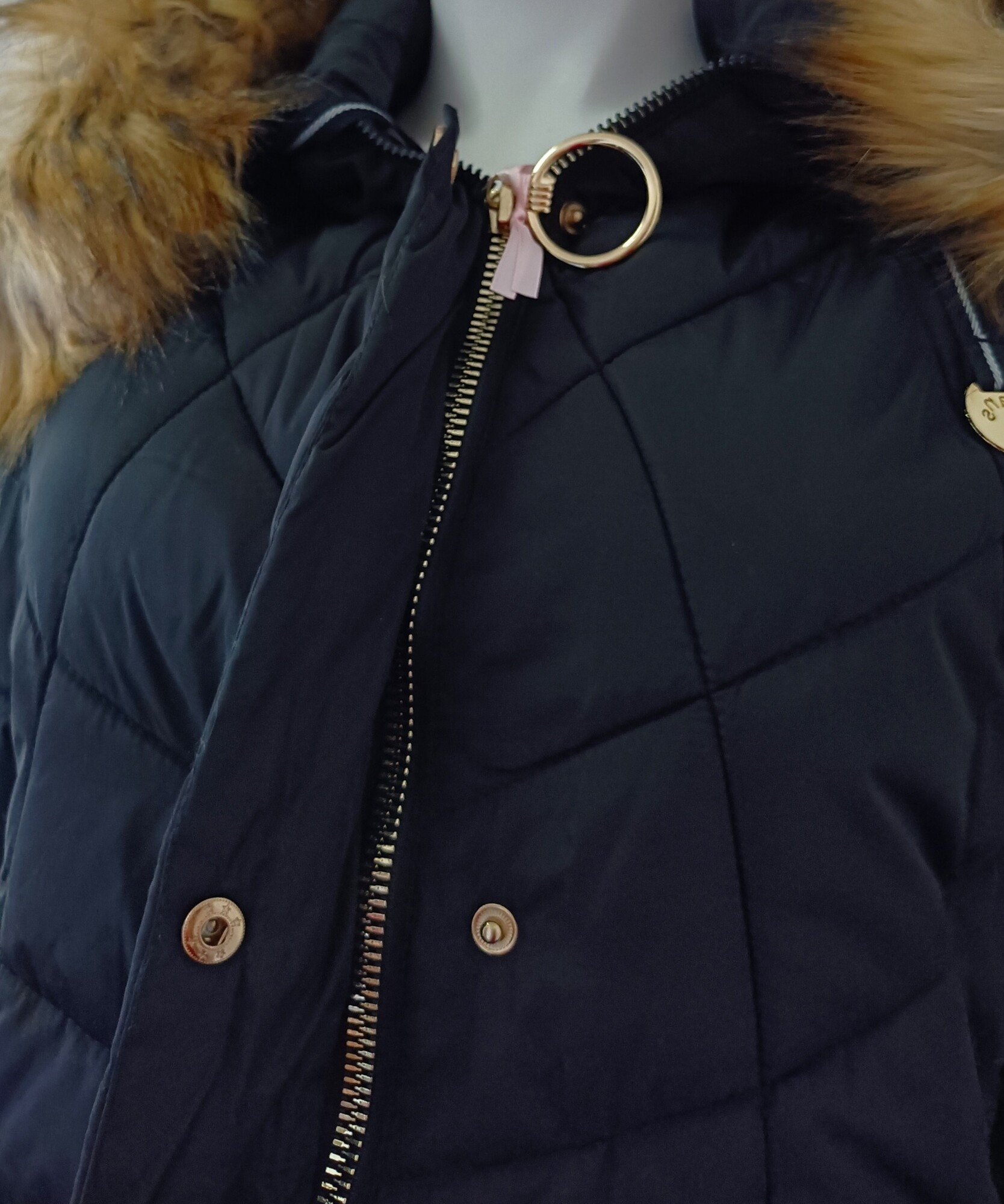 Dámský zimní dlouhý kabát, prošívaný, s kapucí a odepínací kožešinou.