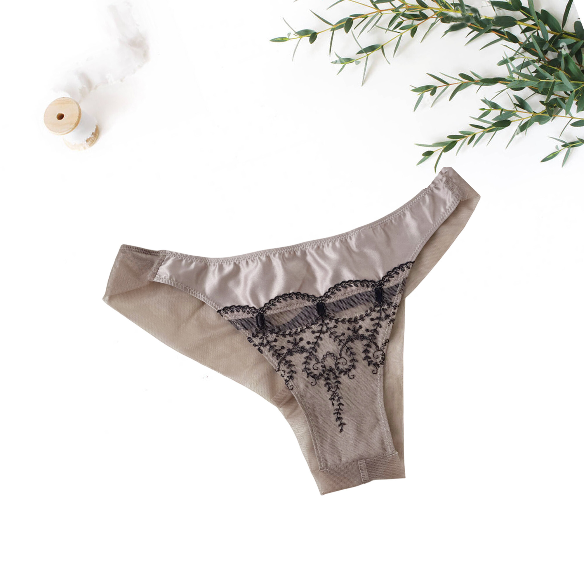 Dámské kalhotky typu brasil, z tylu s ozdobneou stužkou v zadní části a saténu s krajkou v přední části.