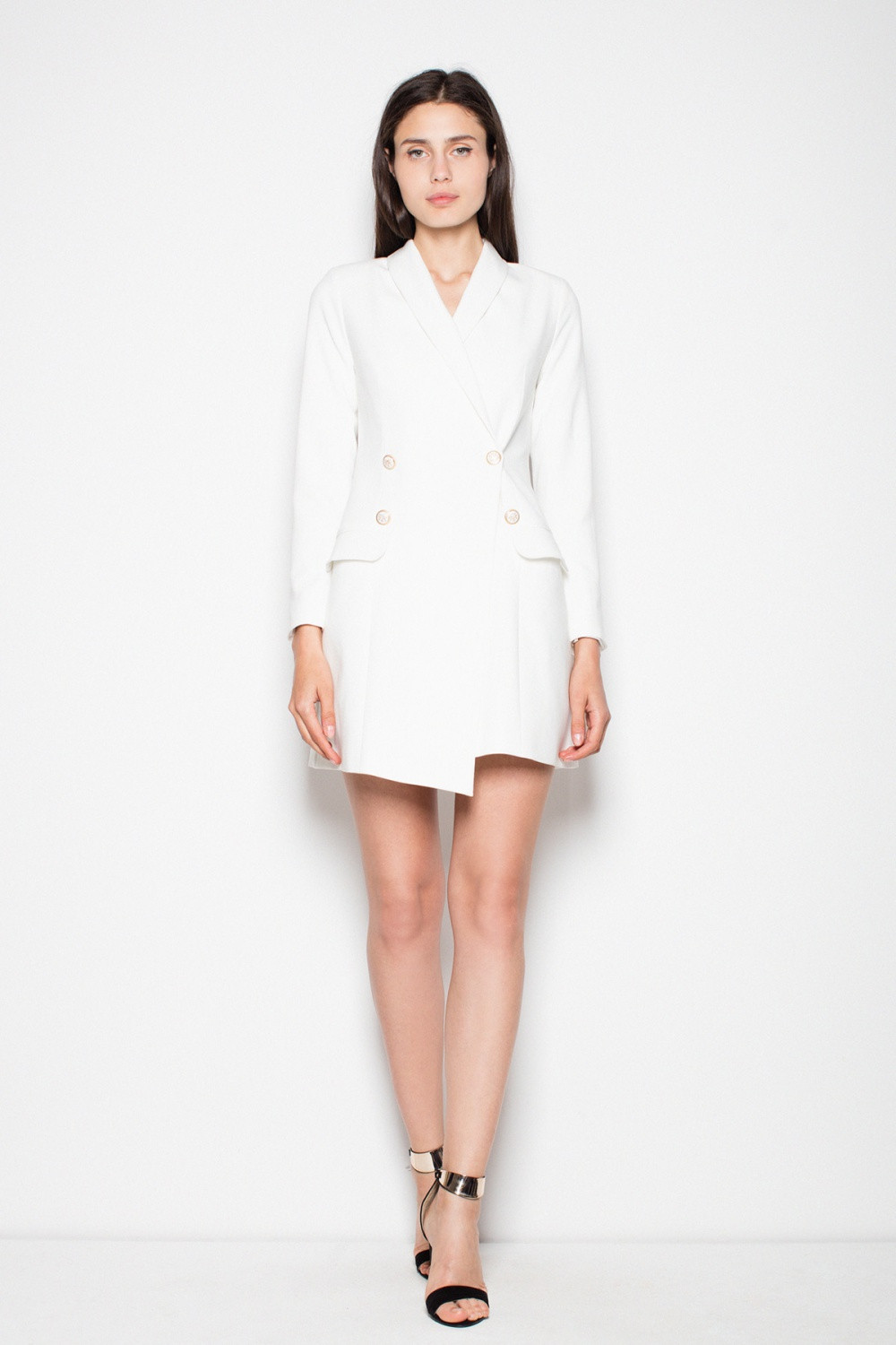 Elegantní žaketové šaty se zapínají na ozdobné knoflíky, které se objevují i na rukávech. Šaty jsou k dispozici v klasických barvách. Lze nosit i jako sako.