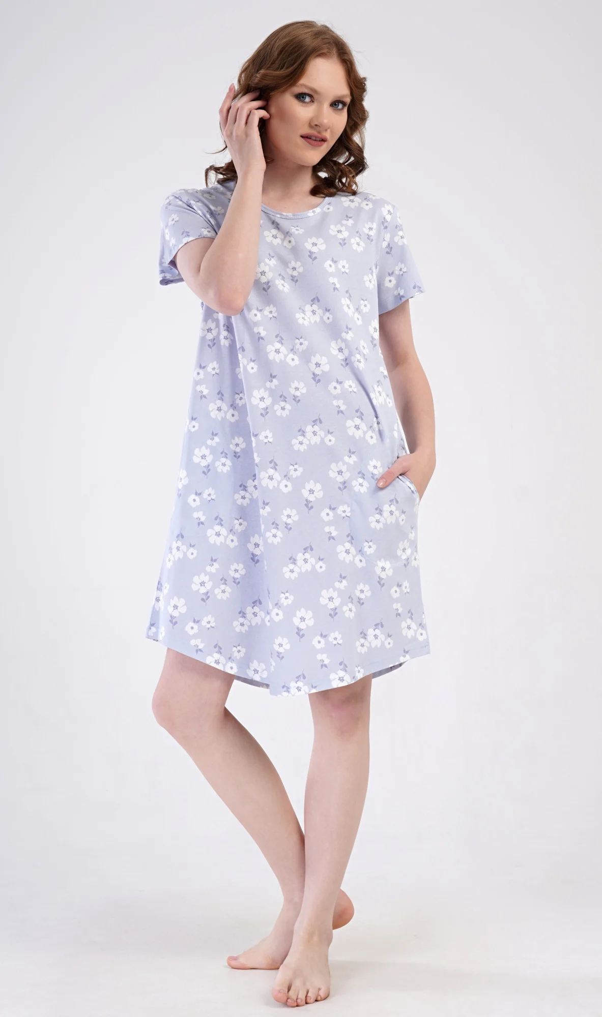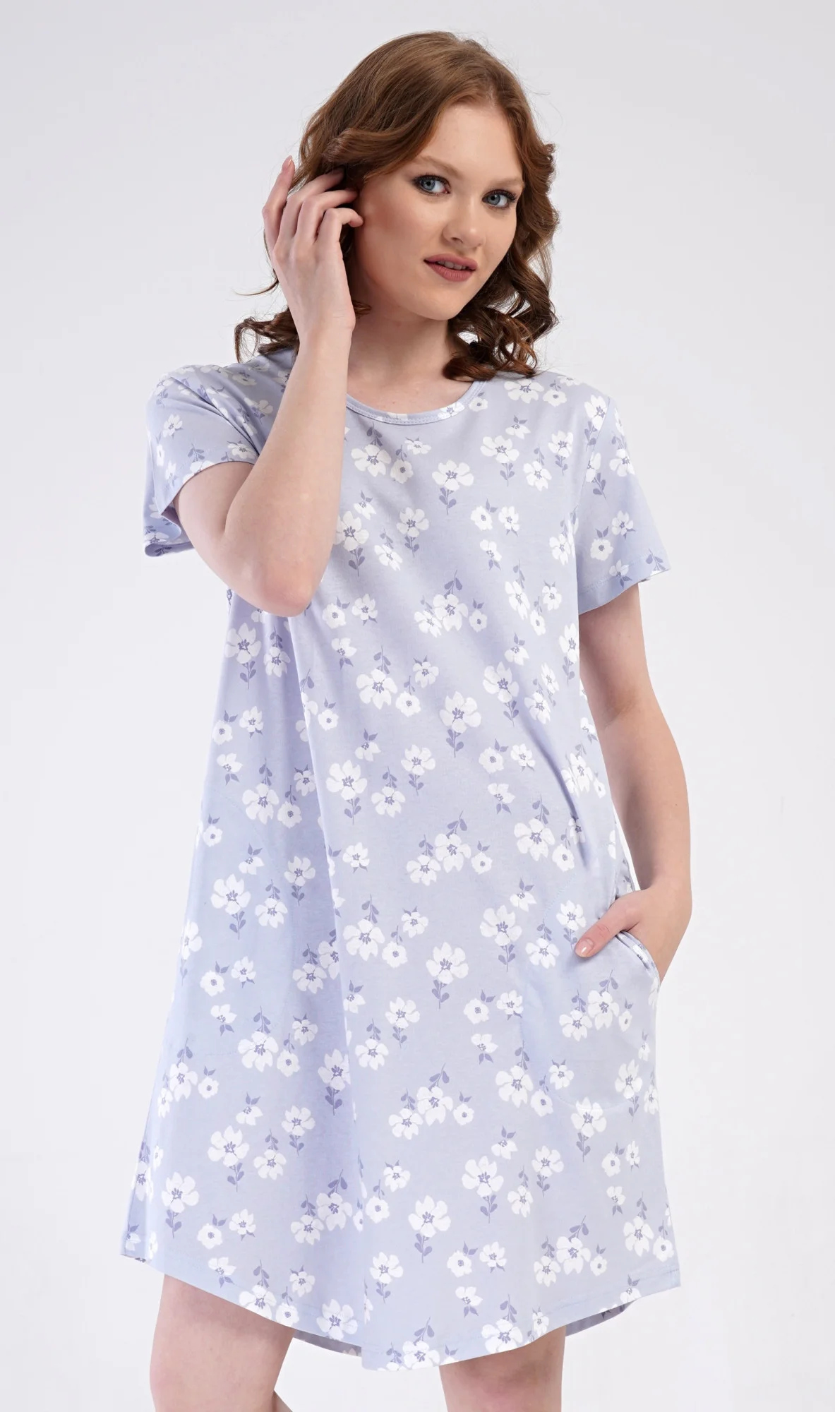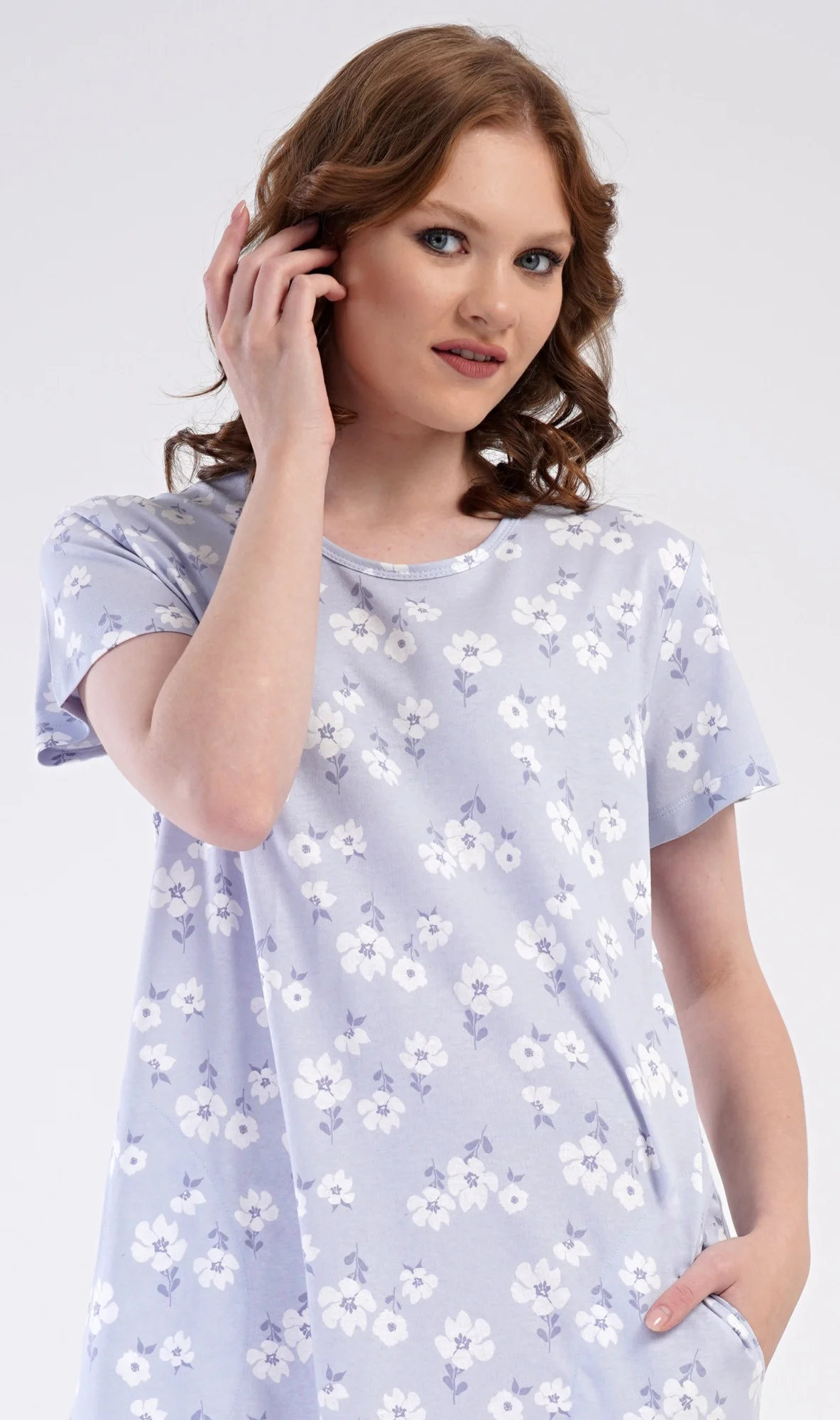 Dámské bavlněné domácí šaty s krátkým rukávem Nature. Domácí jednobarevné šaty s kulatým výstřihem a kapsami zdobí jemné bílé květy. Použitý bavlněný materiál je příjemný a poddajný na dotek. Šaty jsou pohodlné, vhodné na spaní i na denní nošení.