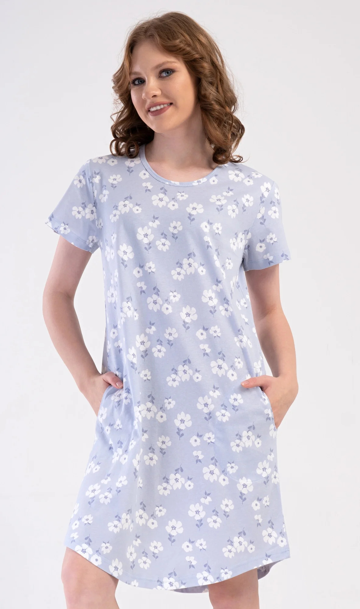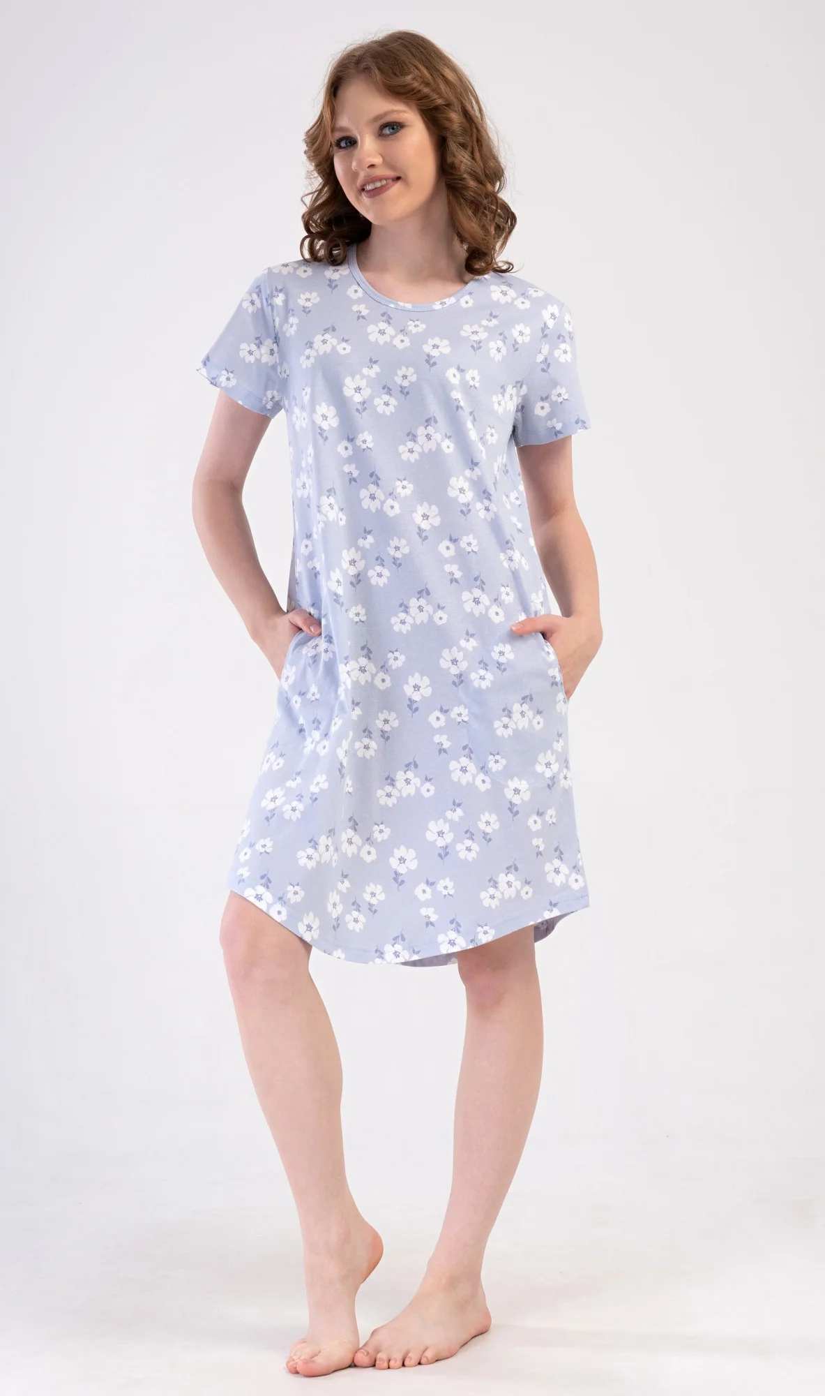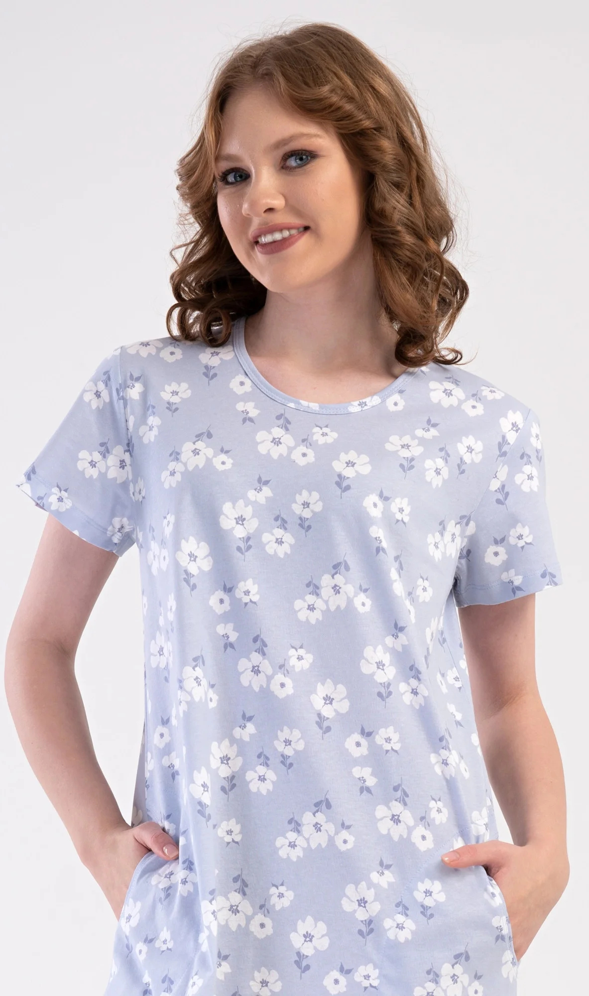 Dámské bavlněné domácí šaty s krátkým rukávem Nature. Domácí jednobarevné šaty s kulatým výstřihem a kapsami zdobí jemné bílé květy. Použitý bavlněný materiál je příjemný a poddajný na dotek. Šaty jsou pohodlné, vhodné na spaní i na denní nošení.