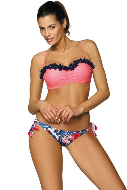 Módní dvoudílné plavky, které oceníte jak při plavání, tak i při opalování. Podprsenka modelu má střih typu bardotka a je ozdobená kontrastními květy. Košíčky jsou vytvarované. Ramínka je možné nastavit i odepnout. Podprsenka se vzadu zavazuje. Kalhotky typu brazilky se na bocích zavazují. Zadní díl kalhotek je vyrobený ze dvojité látky. Kalhotky zdobí květinový vzor. Model je vyrobený z velmi kvalitní italské látky Carvico Tesutti. Plavky rychle usychají a odolávají působení slunečních paprsků (neztrácí barvu a tvar).