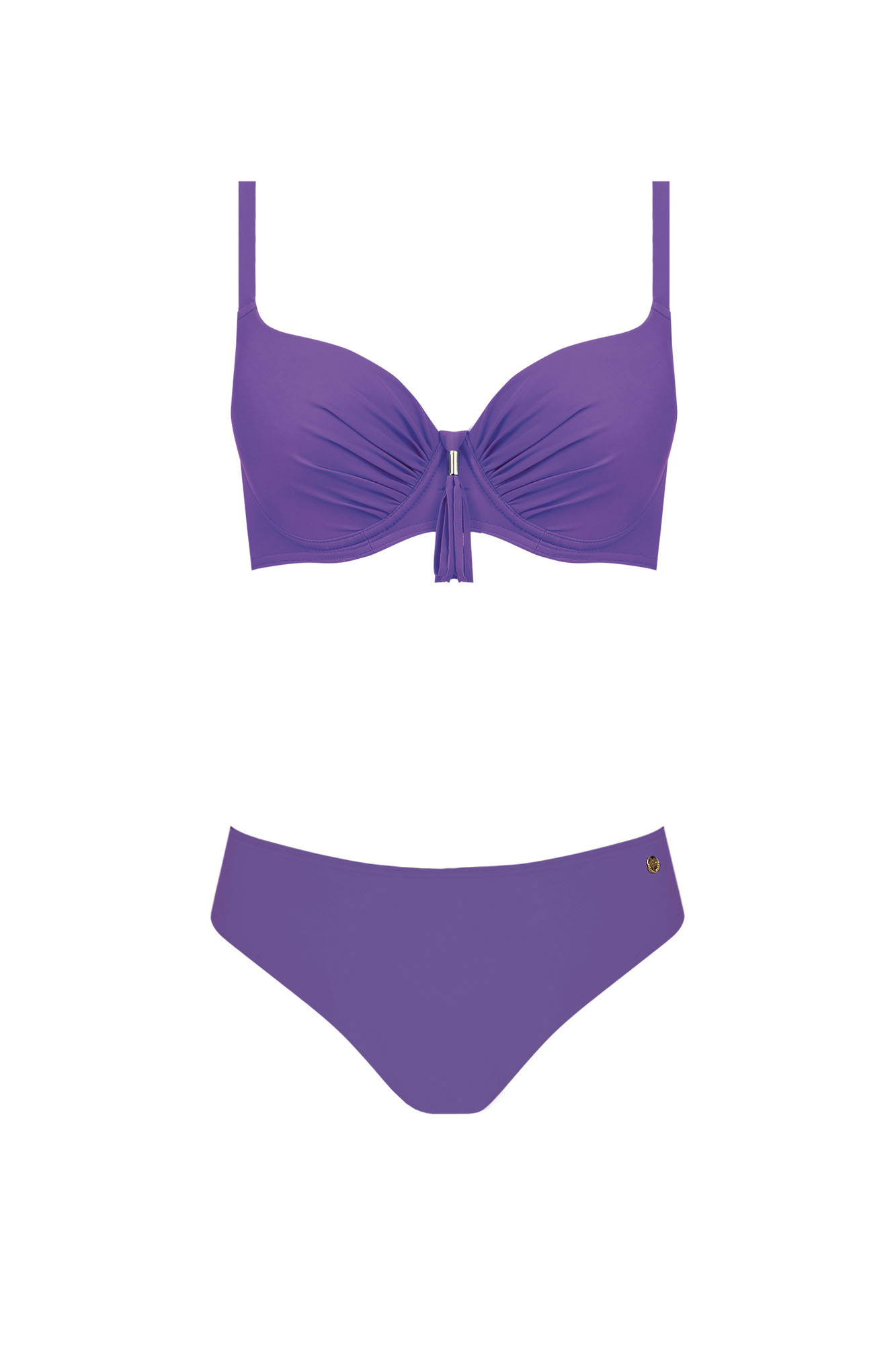 Dámské dvoudílné plavky, spodní díl klasického střihu, vrchní díl vyztužený, s kosticí, hrubé ramínka na posouvání.