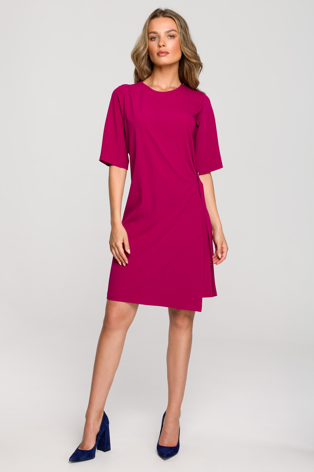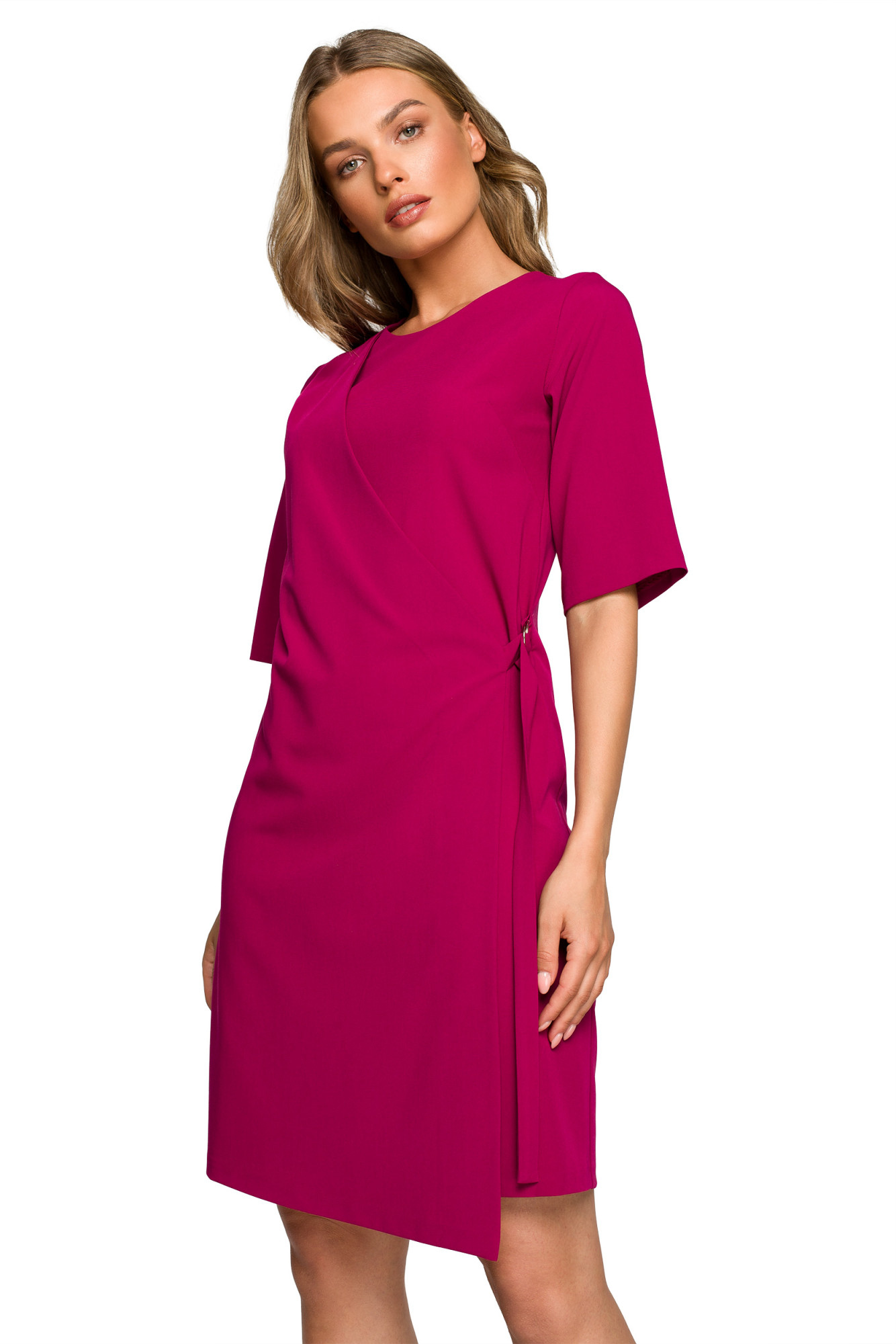 Rovný střih a zavinovací přední díl s ozdobnou sponou na boku zakryjí nedokonalosti postavy a vytvoří elegantní vzhled.