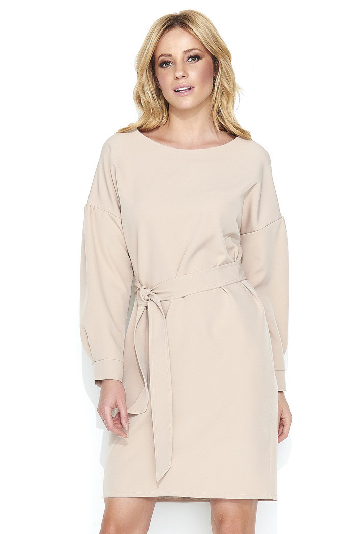 Dámské elegantní šaty s páskem středně dlouhé béžové. Velmi jemné a elegantní šaty s páskem, dlouhými rukávy a kulatým výstřihem jsou vyrobeny z vysoce kvalitního materiálu. Šaty jsou vhodné na společenské události jako je ples, svatba nebo i na běžné nošení do práce.