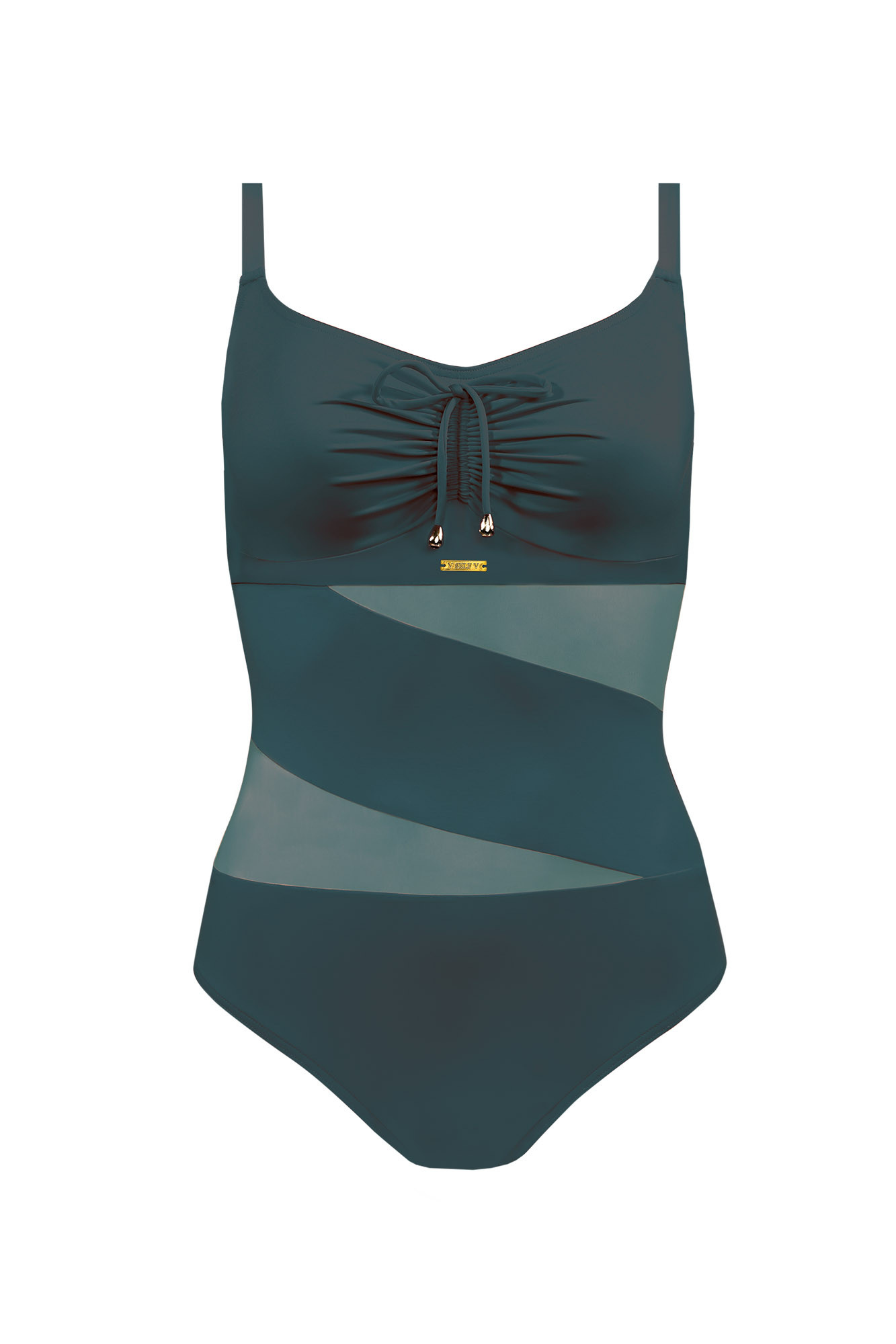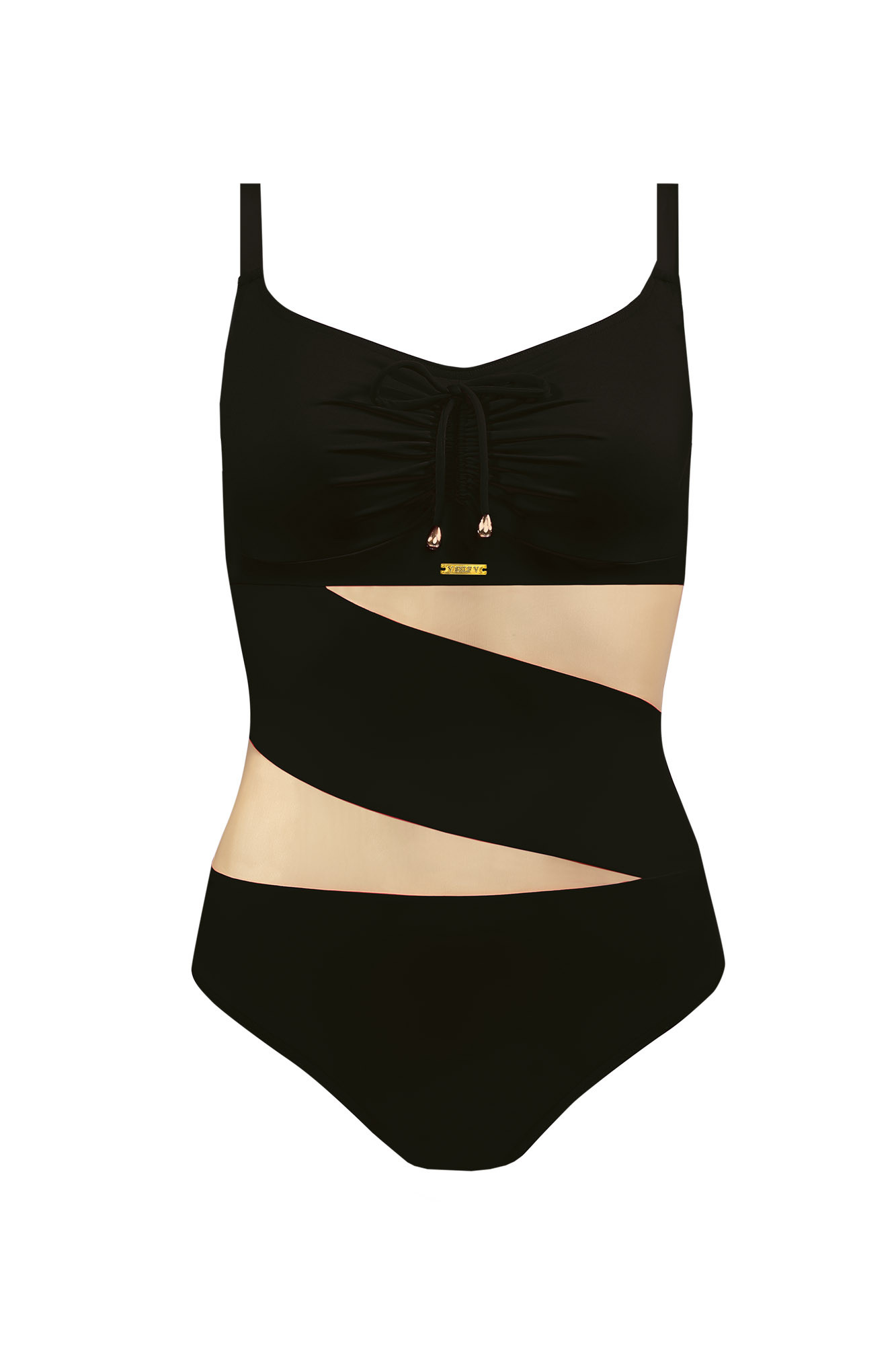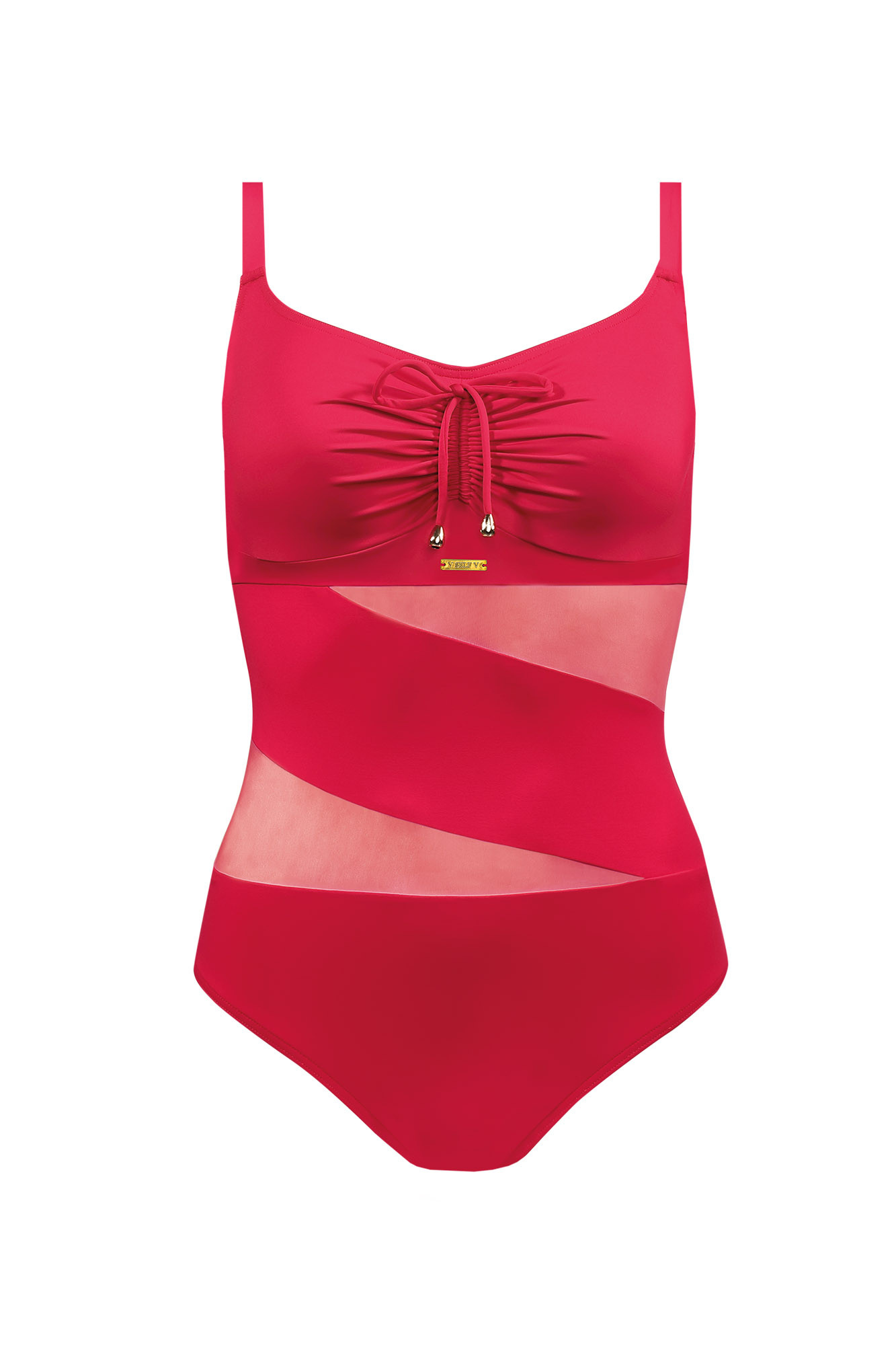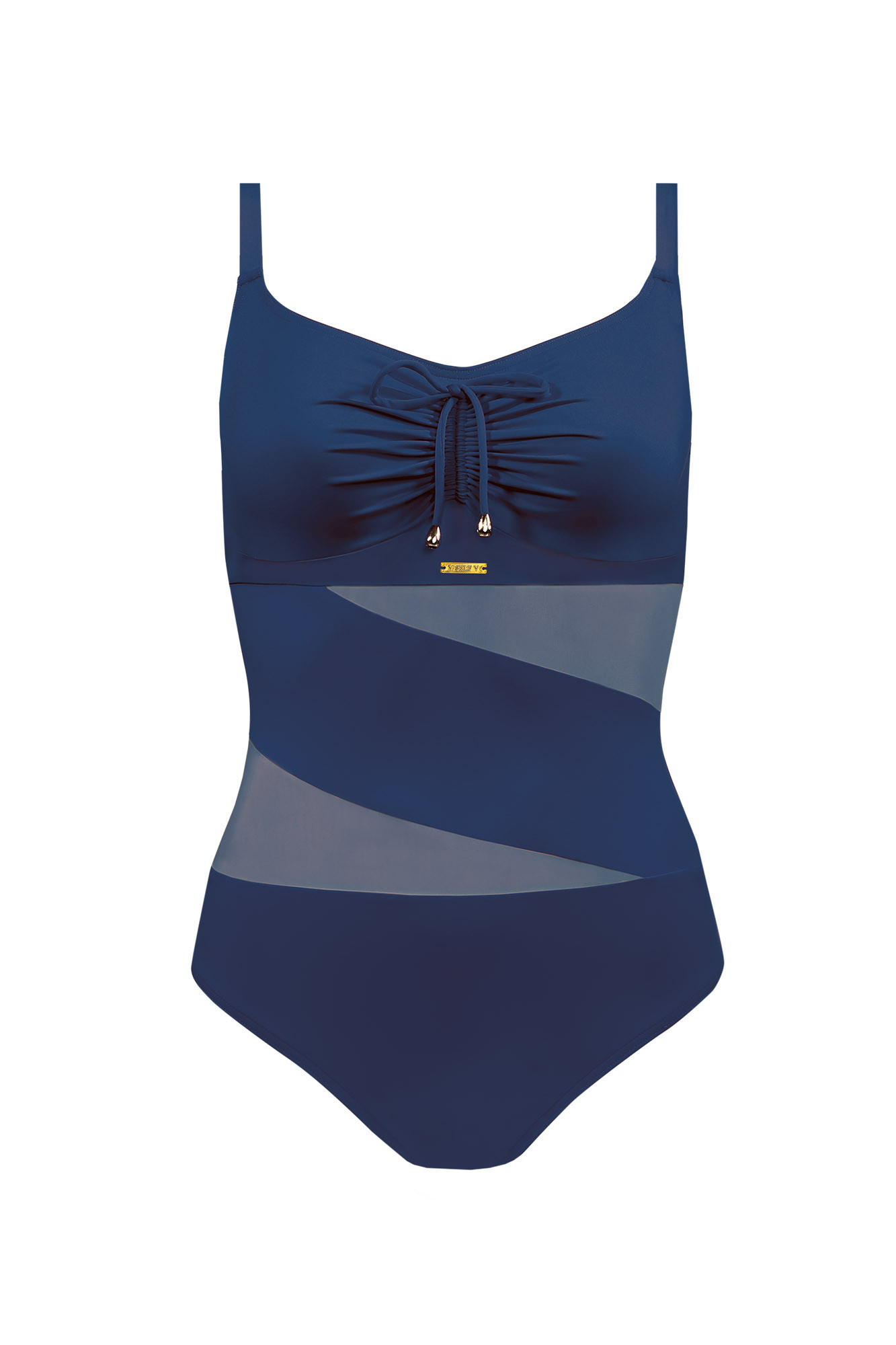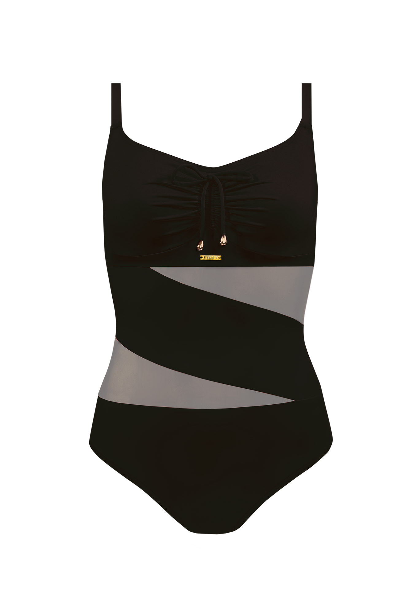 Dámské jednodílné plavky s rafinovanou síťovanou vsadkou. Košíčky jsou vyztužené, s kosticí. Mezi prsy je možné plavky stáhnout sňůrkou. Ramínka mají kovové posouvání.