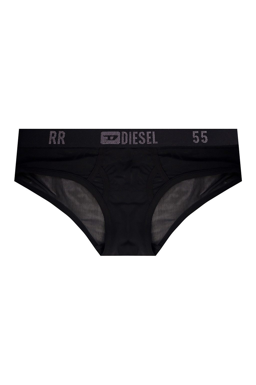 Černé kalhotky od Diesel. Tento pár je vyroben z poloprůhledné síťoviny a má elastický pas zdobený logem štítku vyšívaným stříbrnou lurexovou přízí.