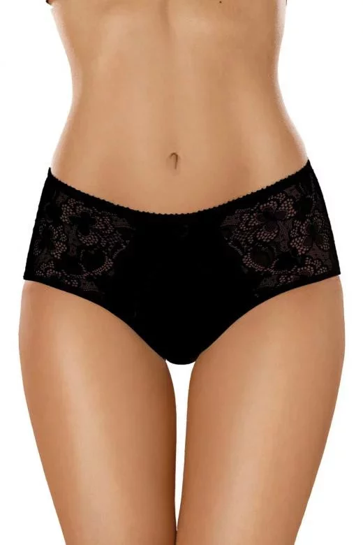 Popis výrobce: Dámské plné kalhotky z kvalitní bavlny, na bocích nabírané. Jemné krajkové vsadky na přední straně. Složení: 95% bavlna, 5% elastan.
