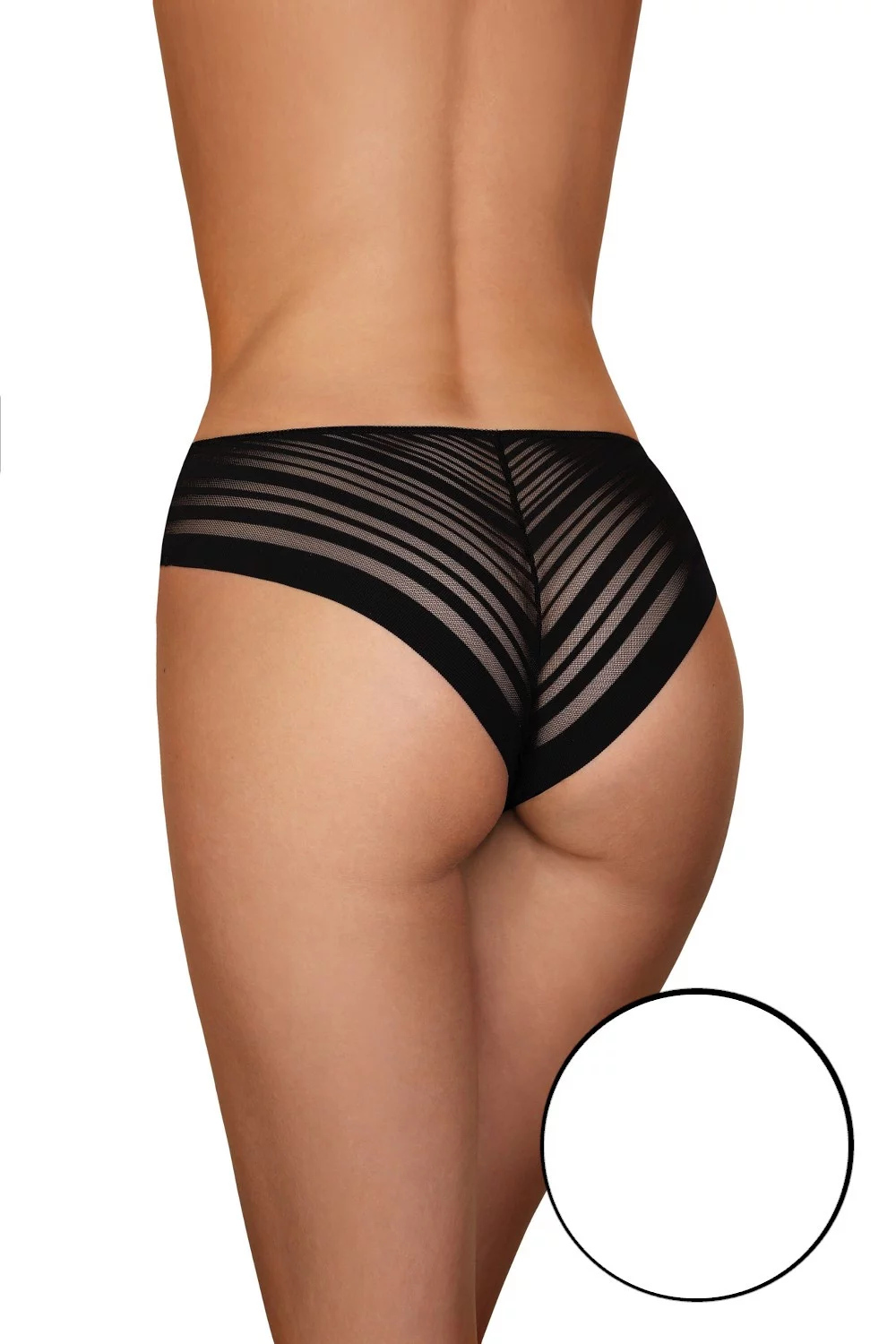 Kalhotky jsou bezešvé. Přední díl modelu je hladký. Zadní díl kalhotek je lemovaný laserem a je ozdobený vsadkami ze síťoviny.