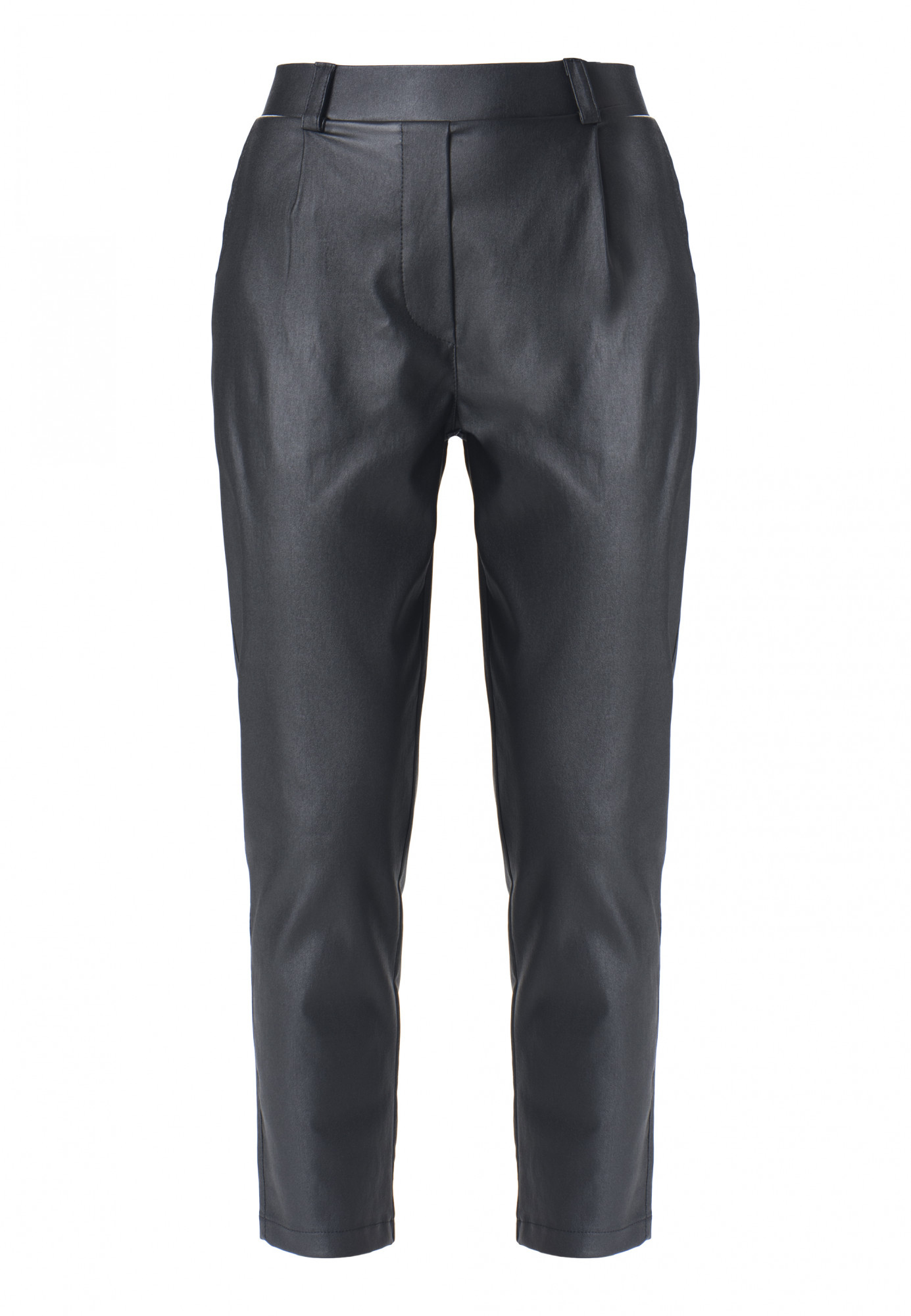 Černé kalhoty z ekokůže, vypasované, pletené. Vysoký pas. Kapsy, elastický pas s gumou v zadní části, záševky vpředu.