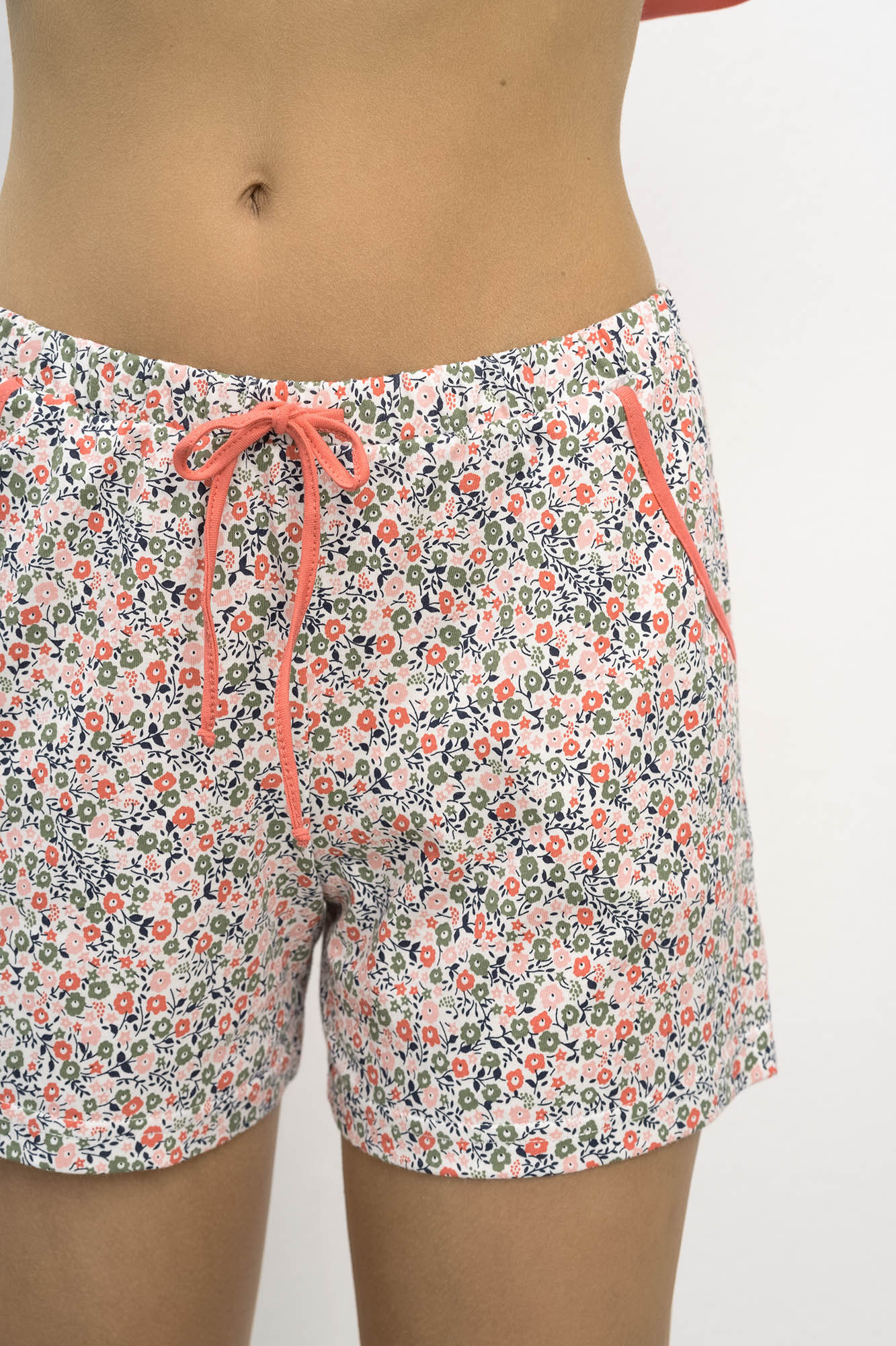Dámské krátké pyžamo. Vrchní díl jednobarevný ve stylu babydoll, na ramínka, spodní díl krátké kalhoty barevné.