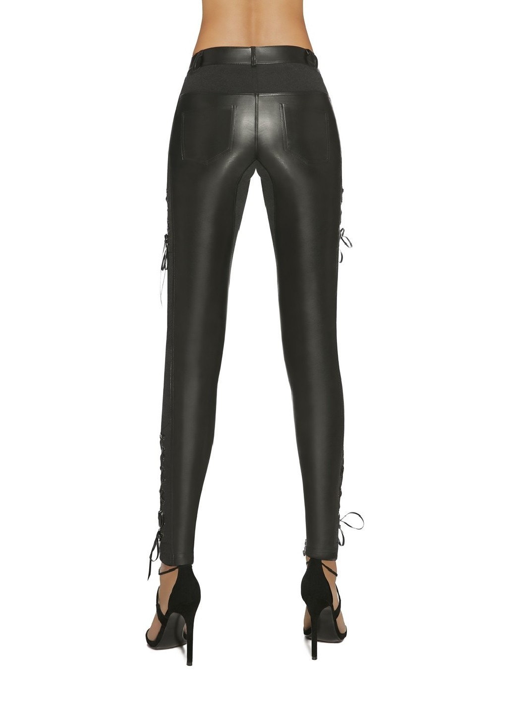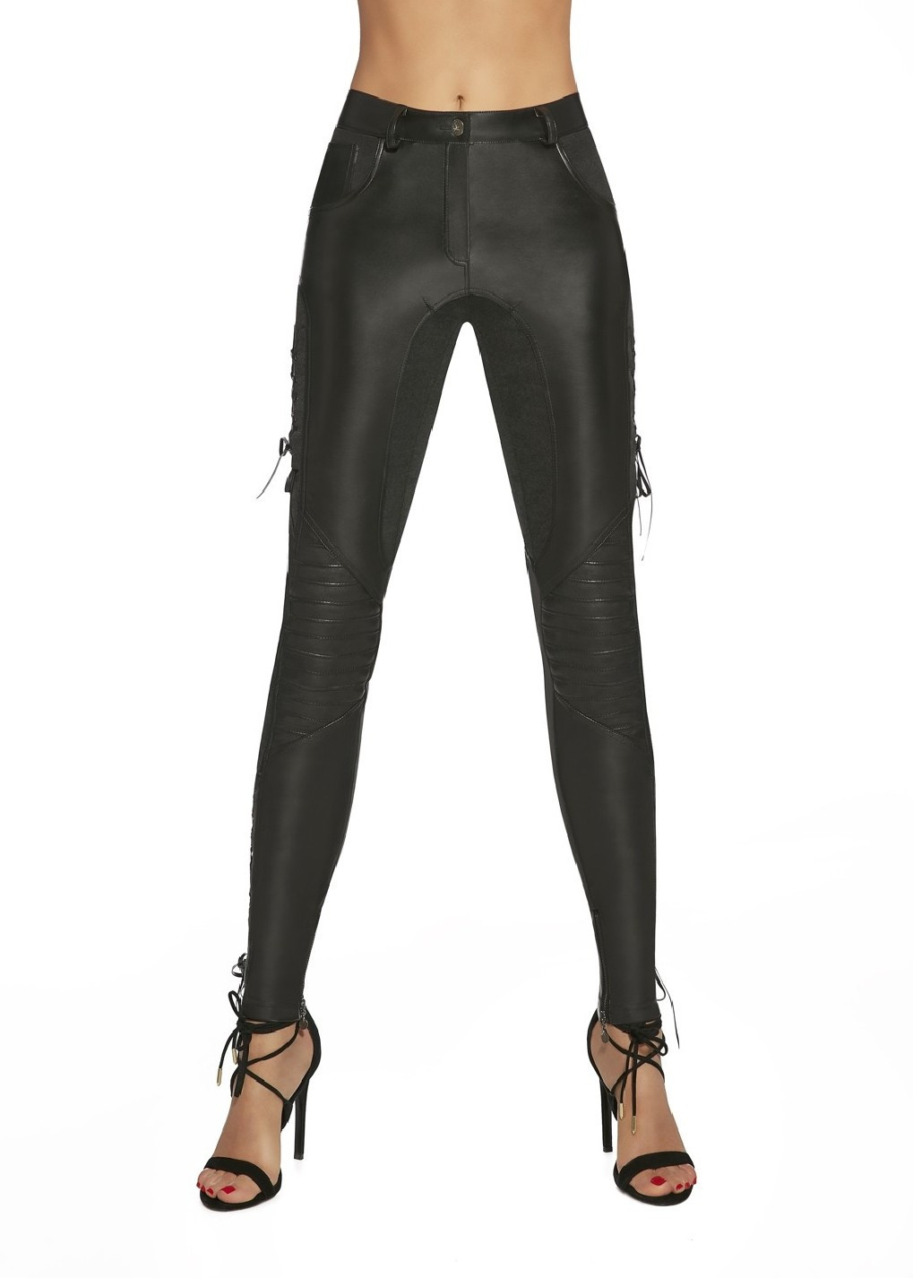 Luxusní přiléhavé legíny BRITTANY, elastické, skvěle padnoucí. Všivky z ekokůže. Na bočních stranách zajímavě působící šněrování. Kapsy vpředu i vzadu. Síla vlákna 200 DEN. Nepřehlédnutelný model.
