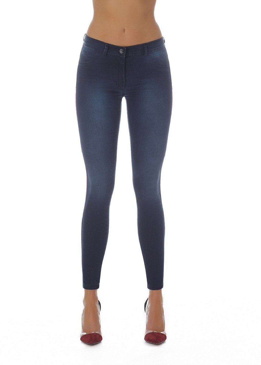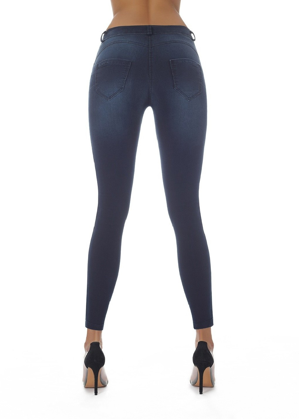 krásně tvarují postavu. Džínový materiál JEANS je pružný a plně krycí. Model je ručně zesvětlený a strojově speciálně upravený - dekatizovaný (neztrácí tvar a barvu). Legíny vynikají svým efektem nadnášených hýždí. Model zdobí ozdobné lampasy. Materiál JEANS je vyrobený z přízí renomovaných producentů s mezinárodním certifikátem Oeko-Tex. Jemnost: 300 DEN.