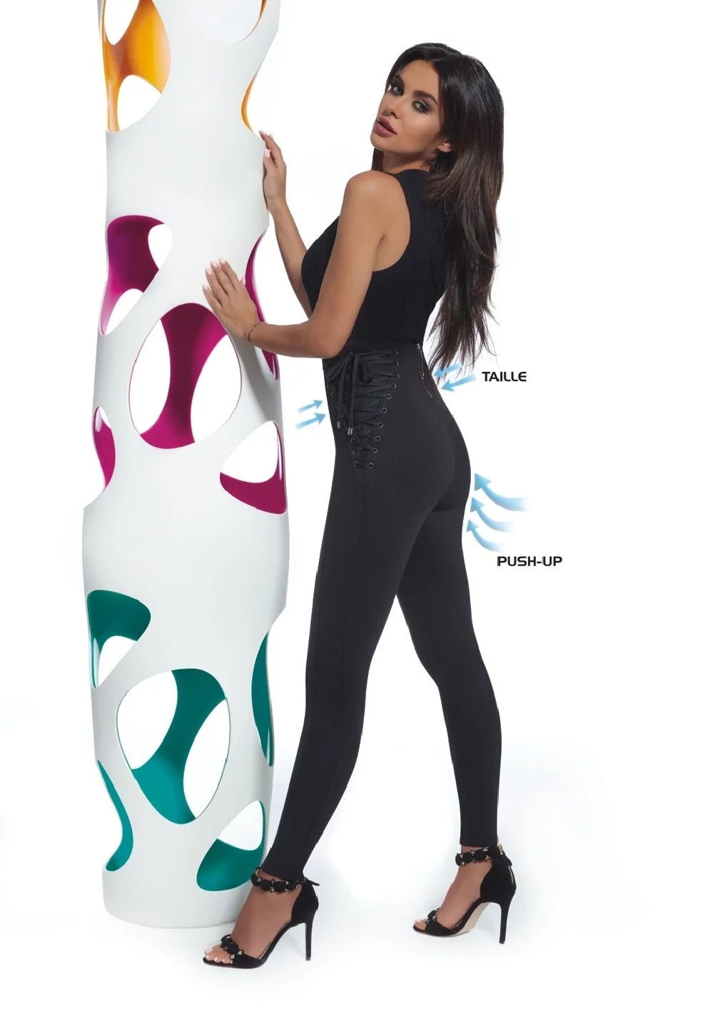 perfektně modelují postavu díky PUSH UP efektu, vyšší pas, na bocích efektní vázání, z elastického materiálu SQUEEZE, vzadu zapínání na zip