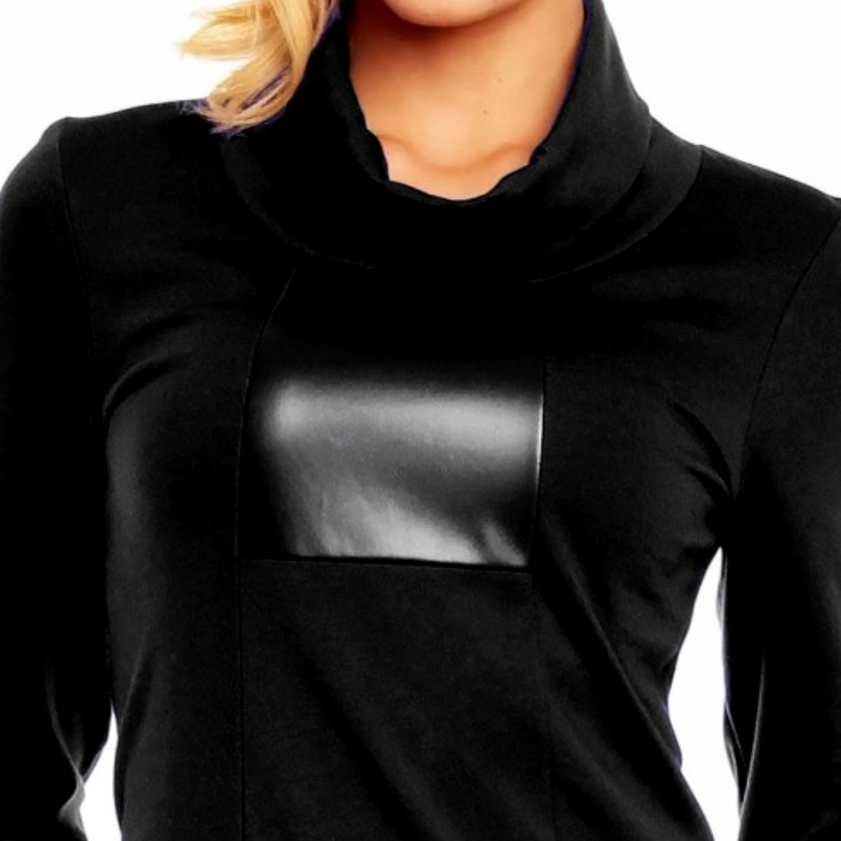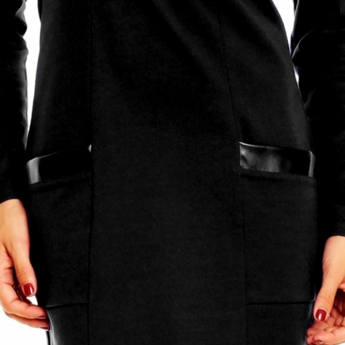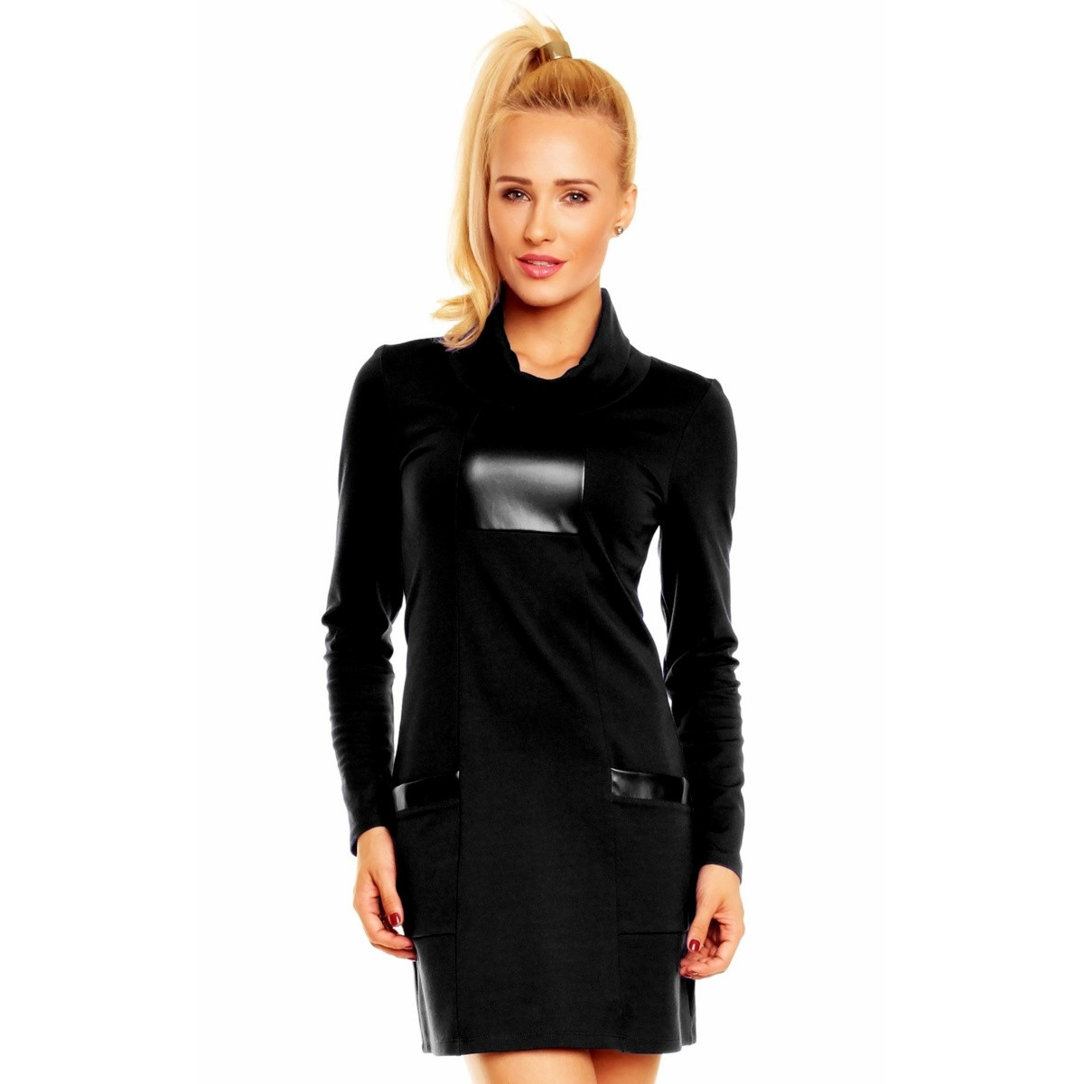 nápaditě řešené značkové společenské a casual šaty. Zdobení je zde vyrobeno z doplňků z populární eko-kůže. Zdobený je živůtek a kapsy v přední části šatů. Kapsy jsou reálné. Šaty jsou středně elastické a směs materiálů, ze kterých jsou vyrobeny obsahuje také ceněnou viskózu, popis materiálů naleznete níže. Dalším výrazným prvkem těchto šatů je rozměrný rolák, který má pouze ozdobný charakter. Tyto kvalitní šaty je možné využít jako casual model, nebo jako šaty do společnosti. Díky jejich nápaditému střihu a doplňkům z eko-kůže, sklidí zcela jistě úspěch a vy se v nich navíc budete cítit pohodlně. Materiál je kvalitní a pevný, jedná se o středně elastickou textilii. Tento model není zamýšlen jako přilehavé šaty na tělo, doporučuje se zde volnější styl, vybírejte podle rozměrů uvedených níže. Elegantní dámské šaty ve formálním stylu.