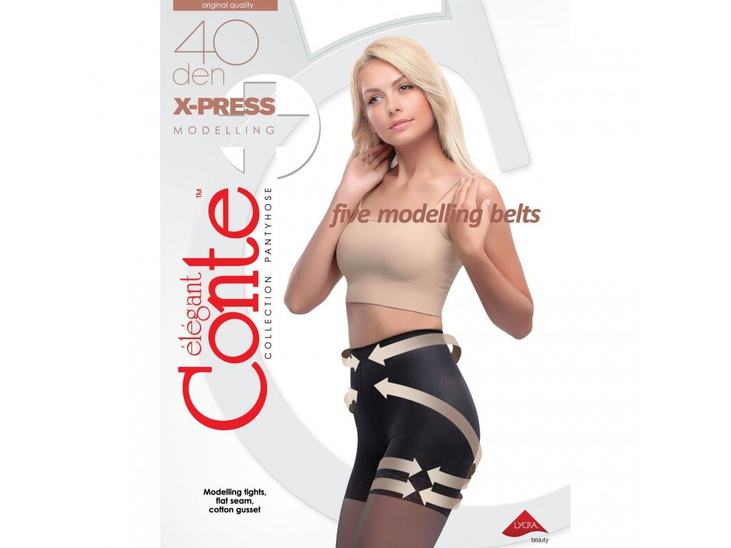 Poloprůhledné 40 den punčochové kalhoty (punčocháče, silonky) Conte X-Press 40 modelující postavu vyrobené z příze LYCRA® BEAUTY. Punčochové kalhoty jsou vhodné pro citlivou pokožku, mají zesílený sed, zesílené špičky a komfortní ploché švy. Malý bavlněný klínek u velikostí 2-S, 3-M a 4-L, velký zadní klín u velikosti 5-XL.