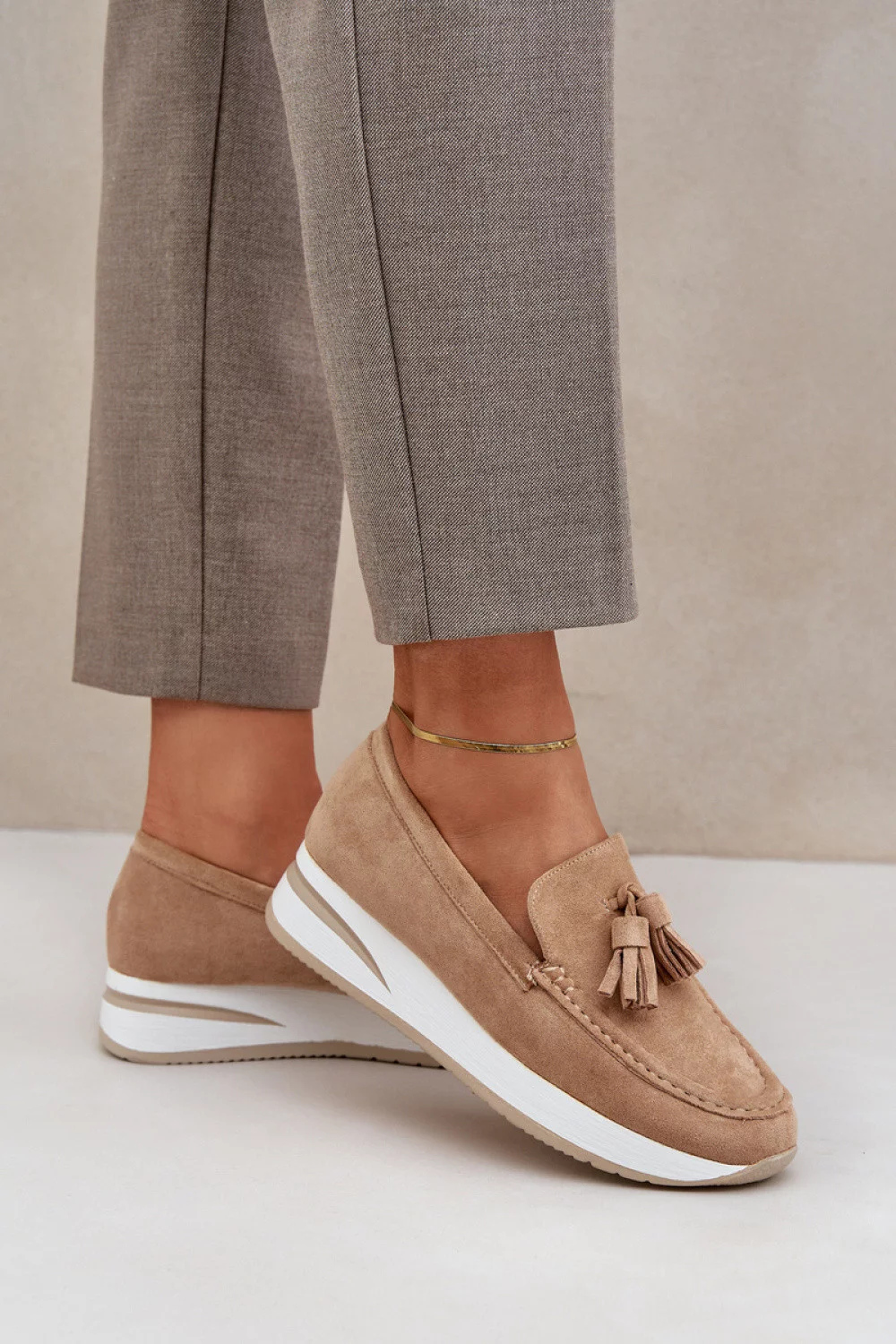 Mokasíny dámské vyrobené z ekosuede. Umístěné na platformě a jemném klínu poskytují pohodlí a lehkost postavě. Zaoblené špičky dělají obuv neuvěřitelně pohodlnou, a měkká stélka pečuje o pohodlí po celý den. Celkový vzhled doplňují ozdobné řasy, které dodávají originální charakter a styl. Ideální pro každodenní outfit!